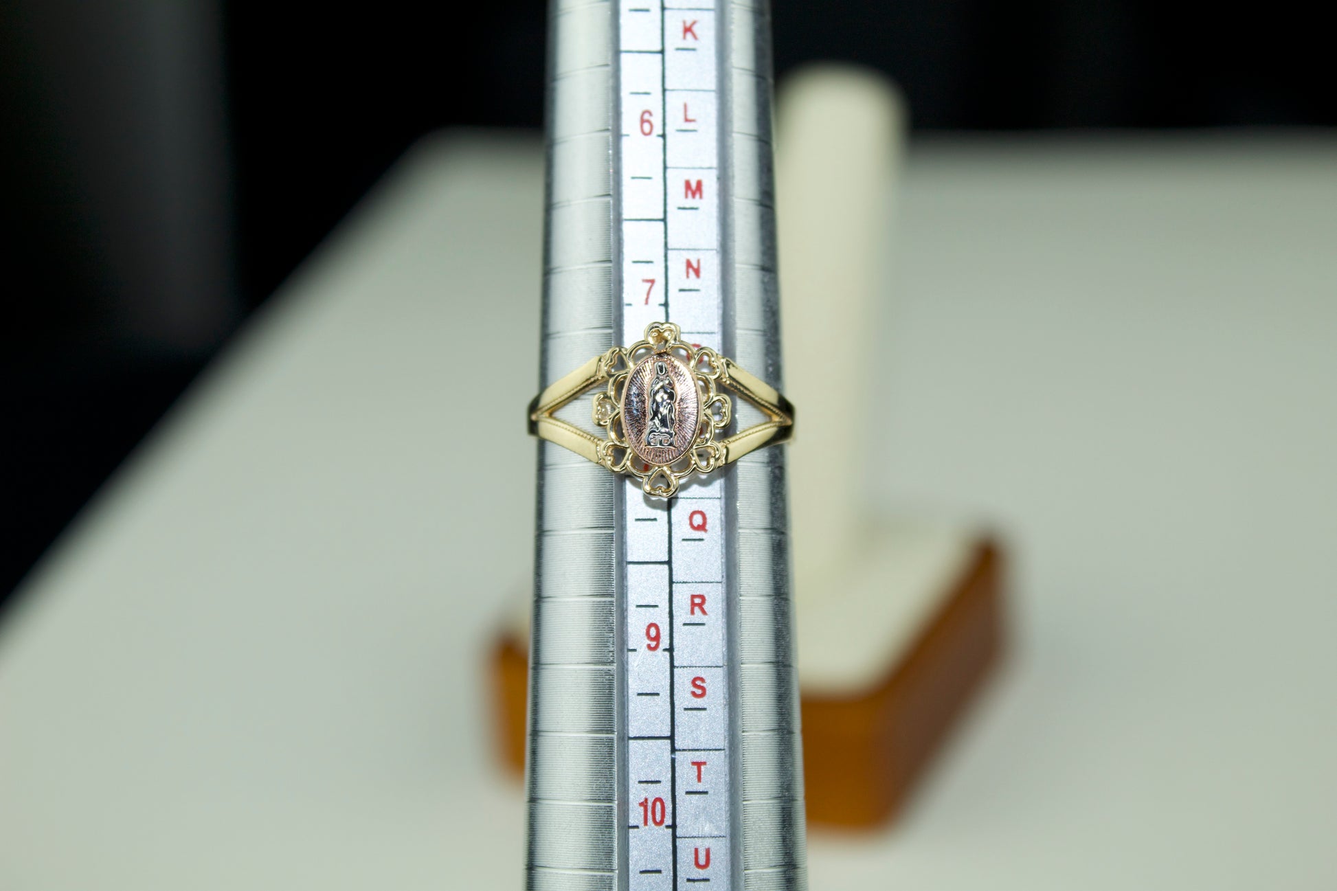 Crafted in solid 14K gold, this 3-Tone Virgen Ring is a meaningful expression of faith and craftsmanship. The center medallion features a detailed depiction of the Virgen, accented in rose, white, and yellow gold. Surrounding it is an intricate heart-shaped filigree frame, adding both elegance and devotion. A timeless piece to wear daily or gift as a cherished keepsake.