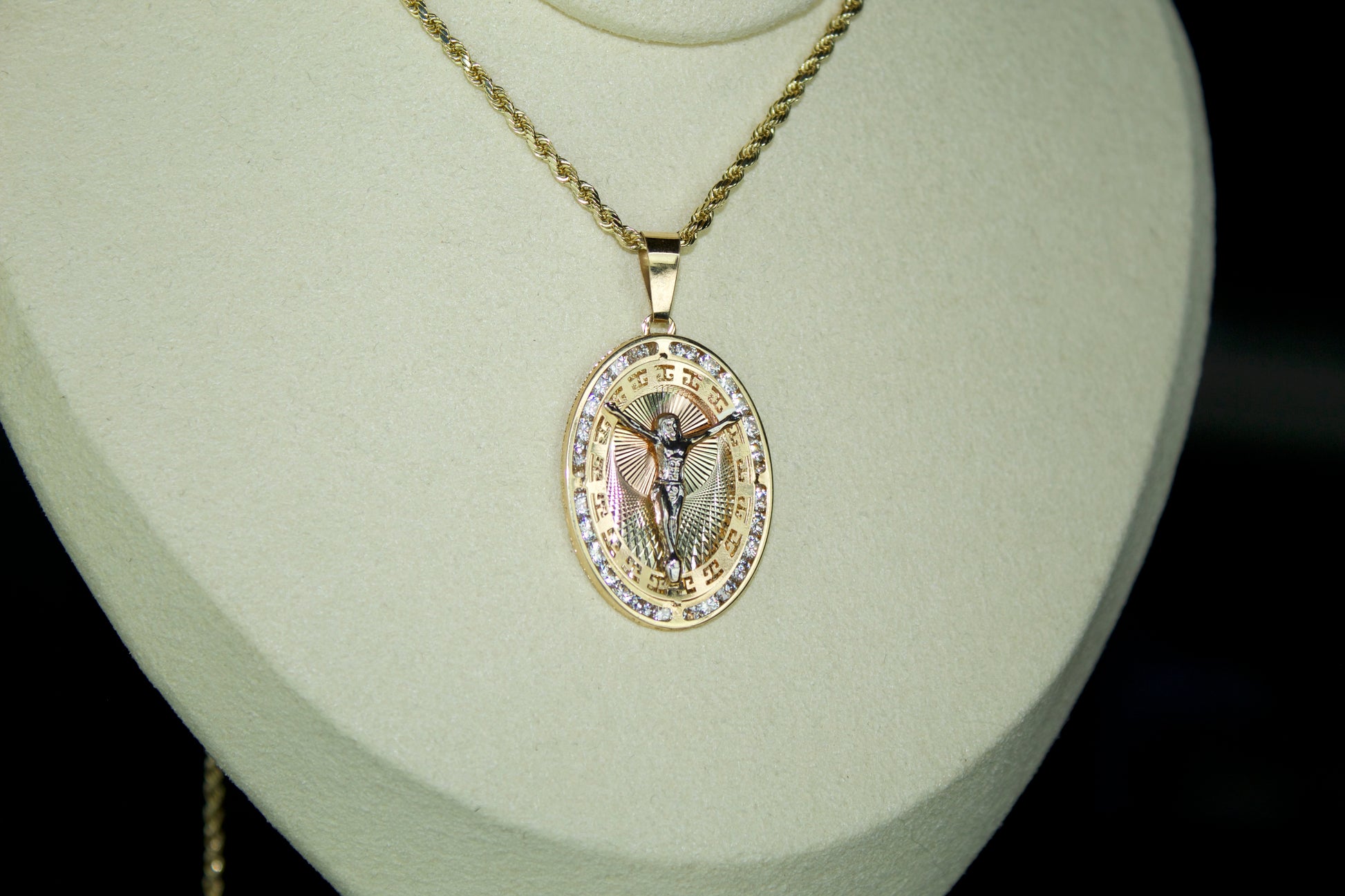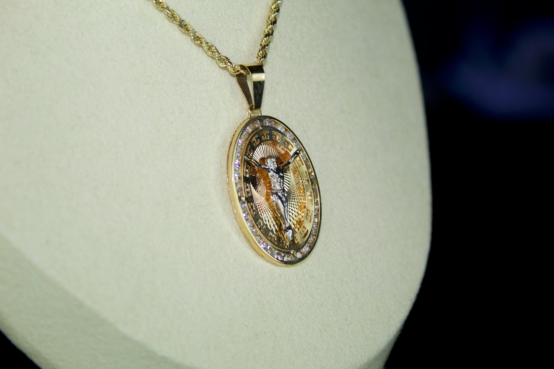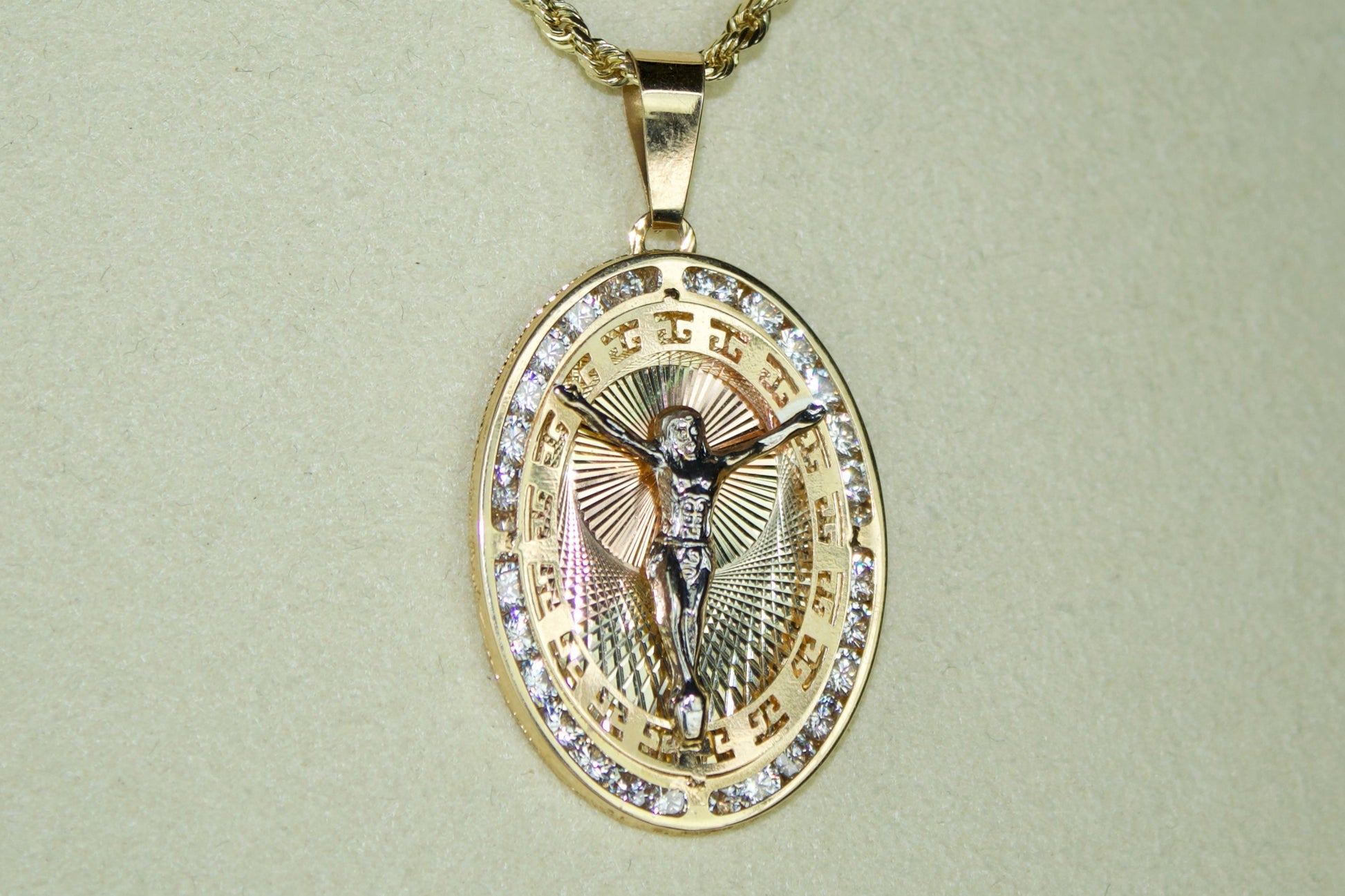 Crafted with reverence and elegance, this 14k Gold Crucifix pendant features a rich three-tone finish—yellow, rose, and white gold—bringing the figure of Christ to life with radiant dimension. The oval frame is surrounded by sparkling CZ stones and a bold Greek key border, making this pendant both a symbol of faith and a luxury statement. Custom made in small quantity exclusively for Oro Arcia.