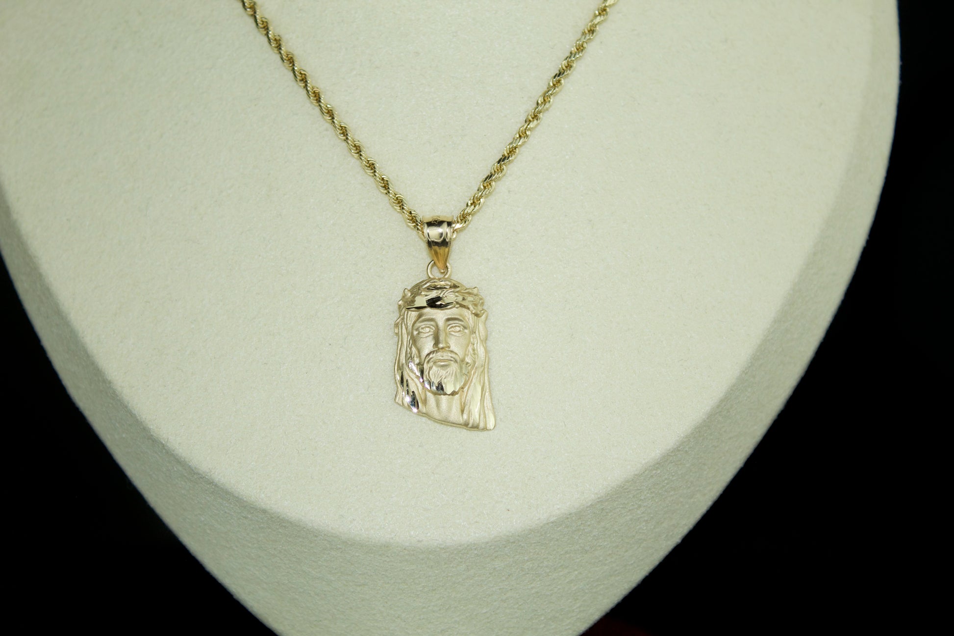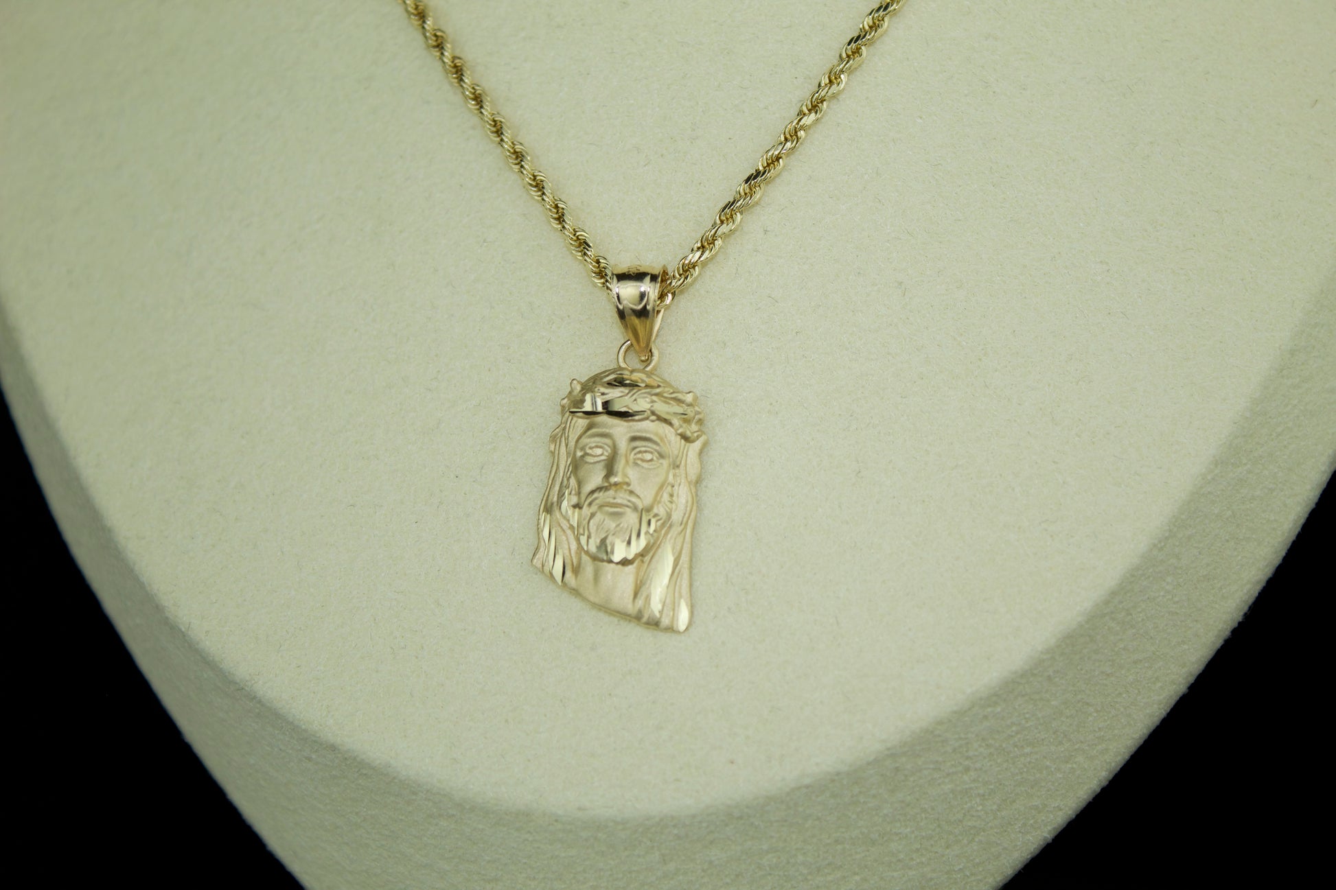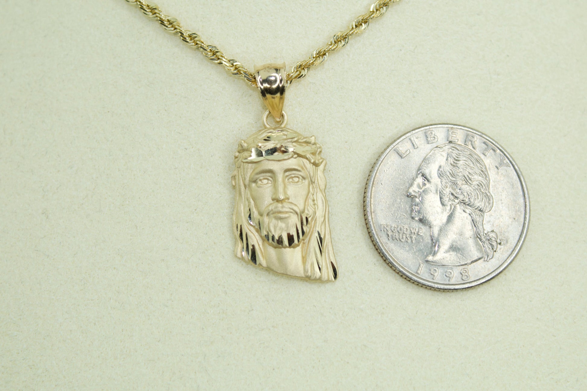 An elegant tribute to faith and craftsmanship, this pendant is meticulously crafted in 14K gold and showcases a detailed depiction of Jesus Christ. Diamond-cut accents bring brilliant reflections to every angle, ensuring this piece stands out with sophistication and meaning. Approximate height: slightly over 1 inch (see photo next to U.S. quarter for scale) Diamond-cut finish for exceptional sparkle 14K stamped for authenticity Pendant only (chain shown for styling purposes)