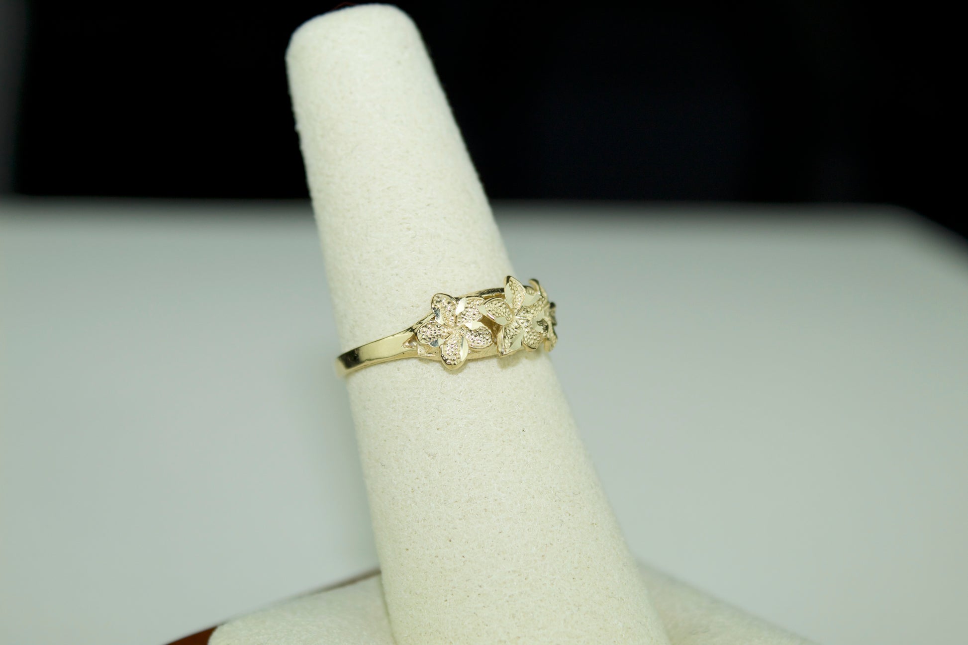 Inspired by the elegance of nature, the Eternal Hibiscus Ring captures the delicate beauty of blooming petals in solid 14K gold. Each flower is crafted with diamond-cut details that shimmer as they catch the light, giving this piece a refined yet playful finish. Whether worn solo as a dainty statement or stacked for a layered look, this ring brings a timeless floral charm to any collection.