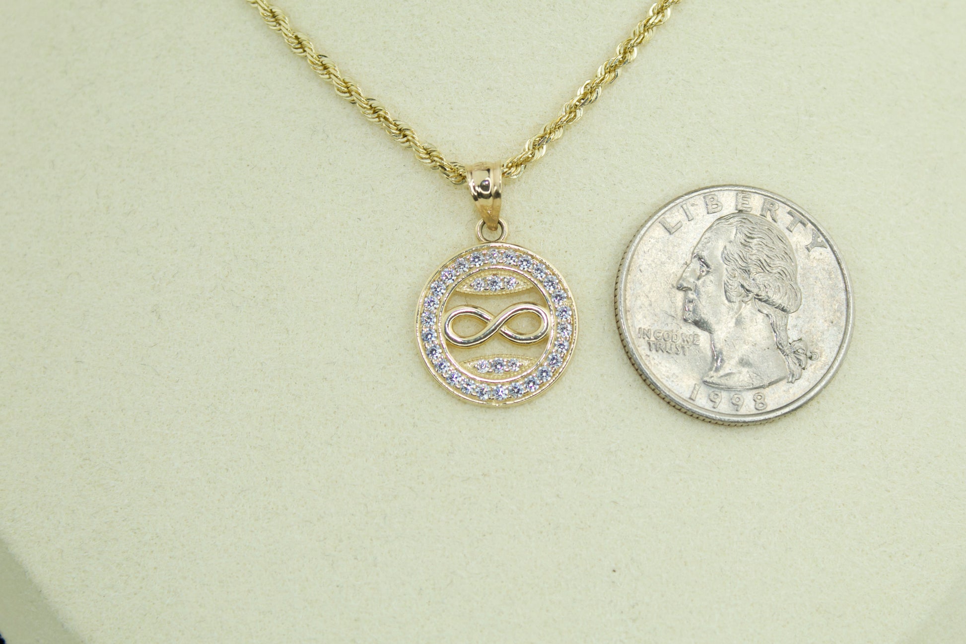 This 14k Gold pendant features a timeless infinity symbol framed by a halo of clear, sparkling accents. Crafted in solid gold and designed to catch the light from every angle, this piece represents eternal connection and self-love. Its balanced size and shine make it a perfect everyday piece or thoughtful gift. Solid 14k gold — stamped and guaranteed Clear CZ halo adds a clean shine Meaningful infinity symbol design Premium finish and craftsmanship Ships from California No restocks — limited availability Please note: Price is for pendant only. Chain not included. Questions? Chat with us directly on the site.