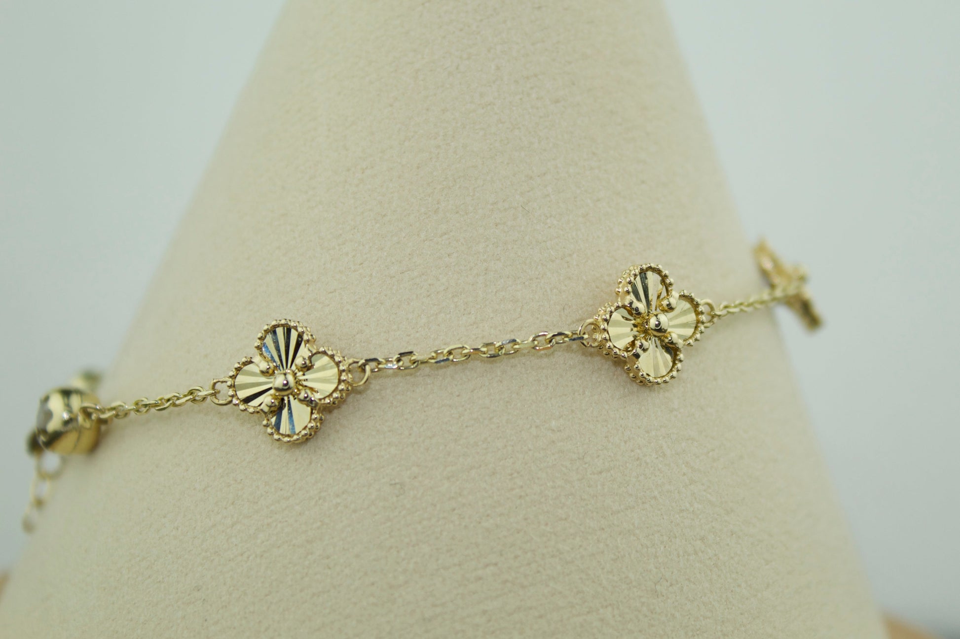 A delicate yet radiant statement, this 14K gold bracelet features a dainty floral clover design with diamond-cut details that catch the light at every angle. It's perfect for layering or wearing solo as an everyday luxury piece.