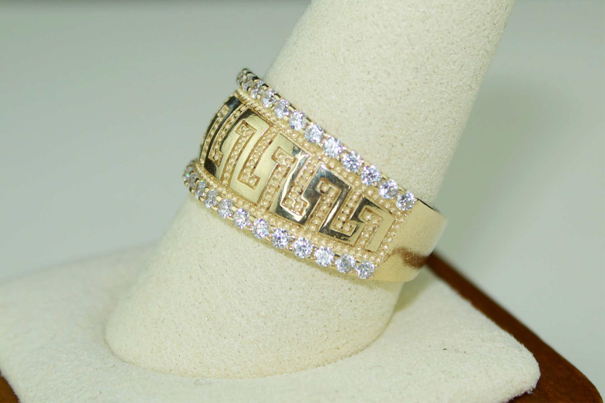 This bold and elegant Greek Key Ring is crafted in solid 14K gold and finished with high-quality cubic zirconia stonesfor a radiant shine. The classic Greek Key pattern represents infinity and unity, making this ring more than just jewelry—it’s a timeless symbol of strength and heritage. Its wide band and double CZ rows add brilliance and presence, perfect for anyone seeking a standout piece that elevates everyday style or makes a powerful statement.