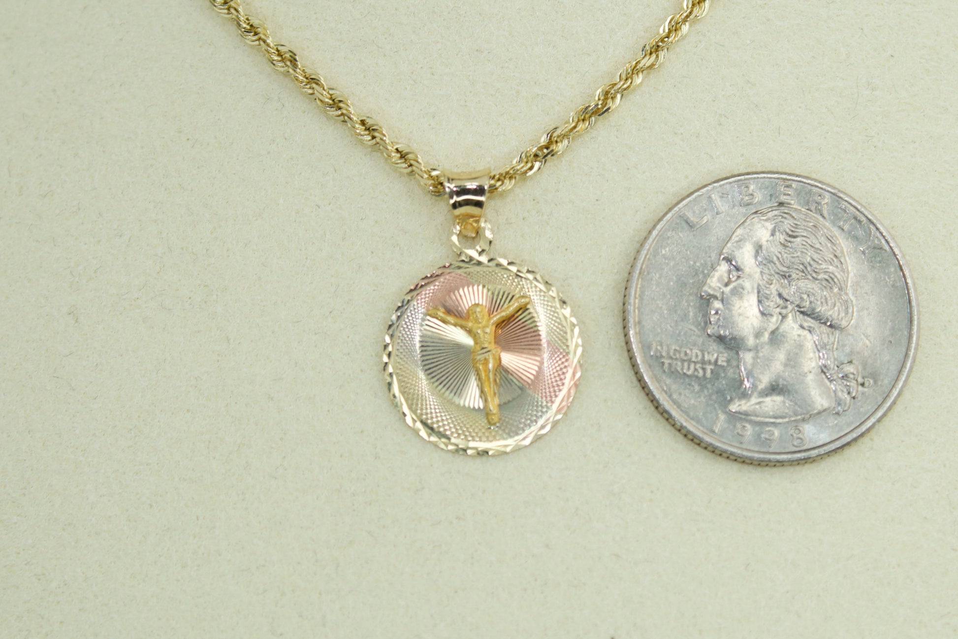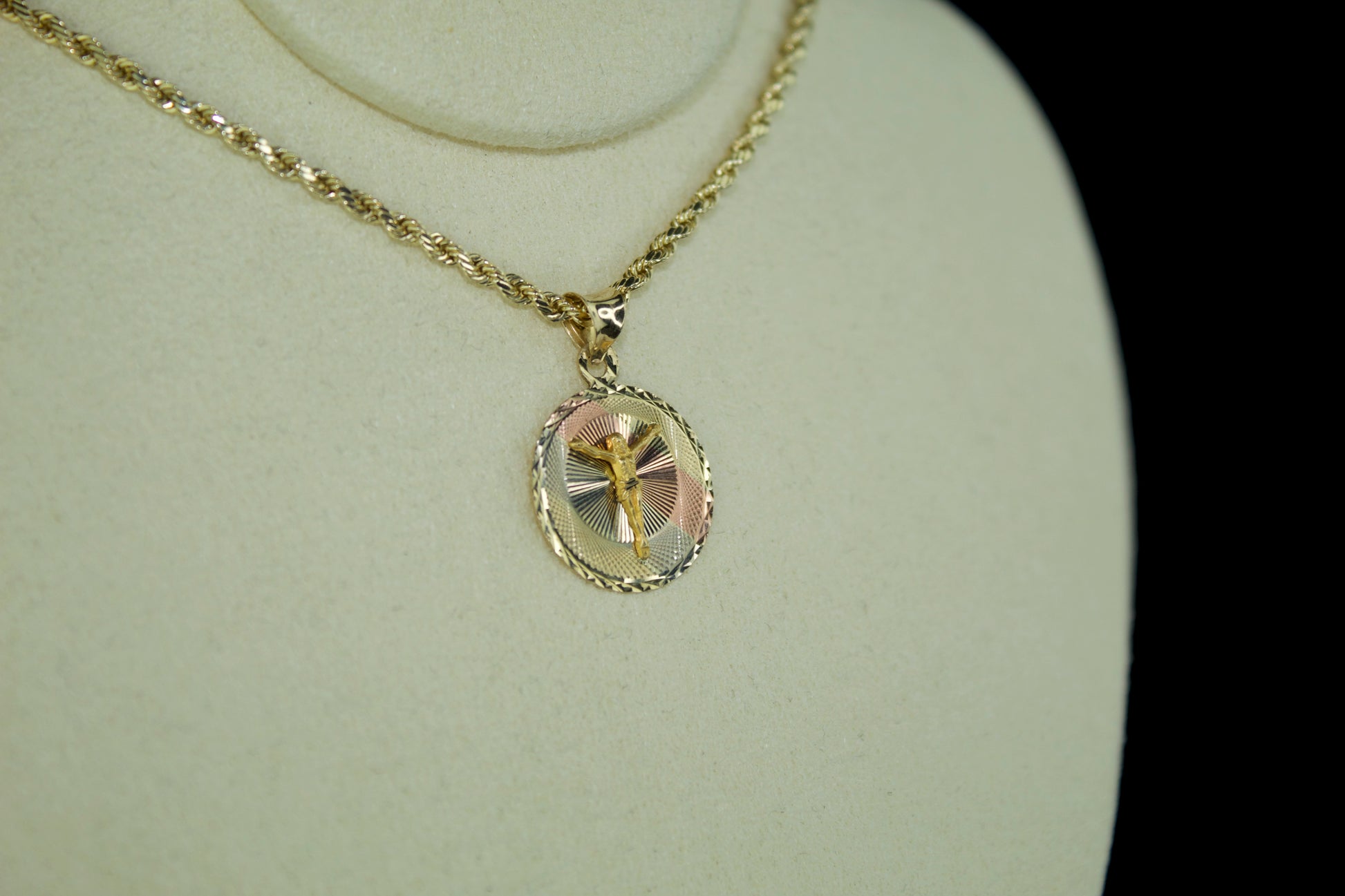 This radiant tri-tone medallion features a detailed crucifix at the center, set against a textured circular backdrop with beautiful diamond-cut edges. Each color reflects a layer of craftsmanship, making it a piece that stands out with elegance and meaning. Perfect for everyday wear, gifting, or layering with other favorites.