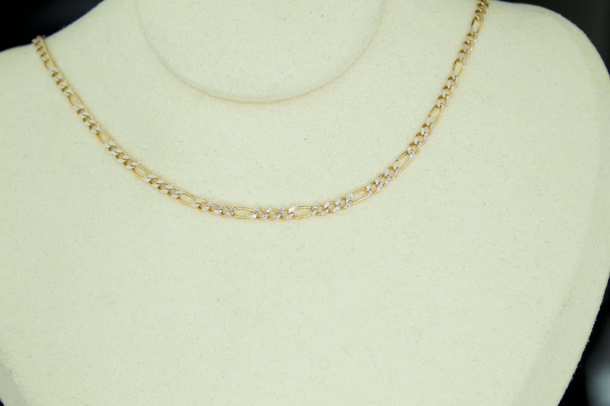 The classic Figaro link pattern is elevated with diamond cut detailing and a two tone finish, combining yellow and white tones that reflect light beautifully. The result is a chain that catches attention without feeling flashy, delivering subtle shine and timeless appeal.