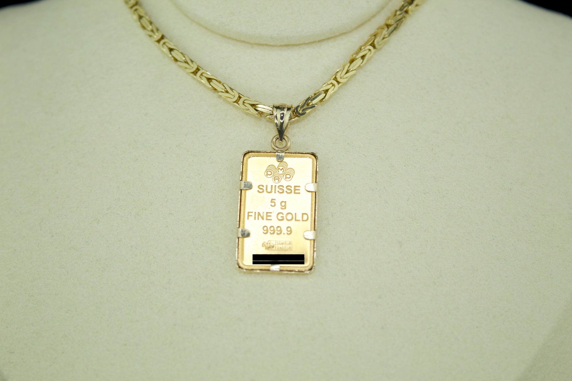 This stunning pendant features an authentic 5g 24K gold PAMP Suisse Lady Fortuna bar, elegantly framed in solid 14K gold. A rare collector’s piece that also makes a bold statement in fine jewelry. Known for its purity and intricate design, this pendant is both an investment and a timeless keepsake. Perfect for those who appreciate true gold value and craftsmanship.