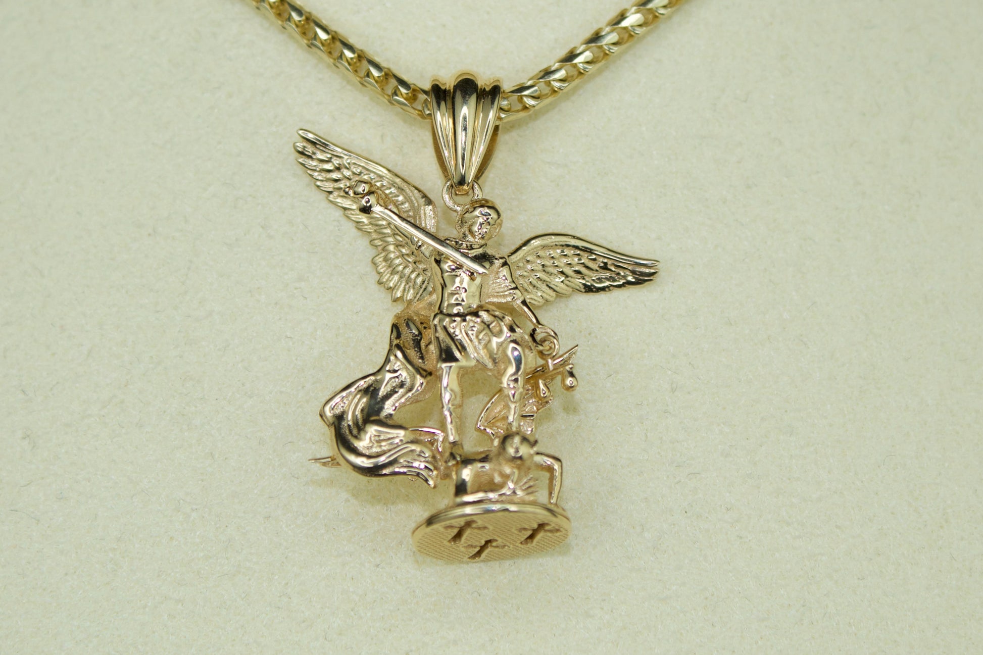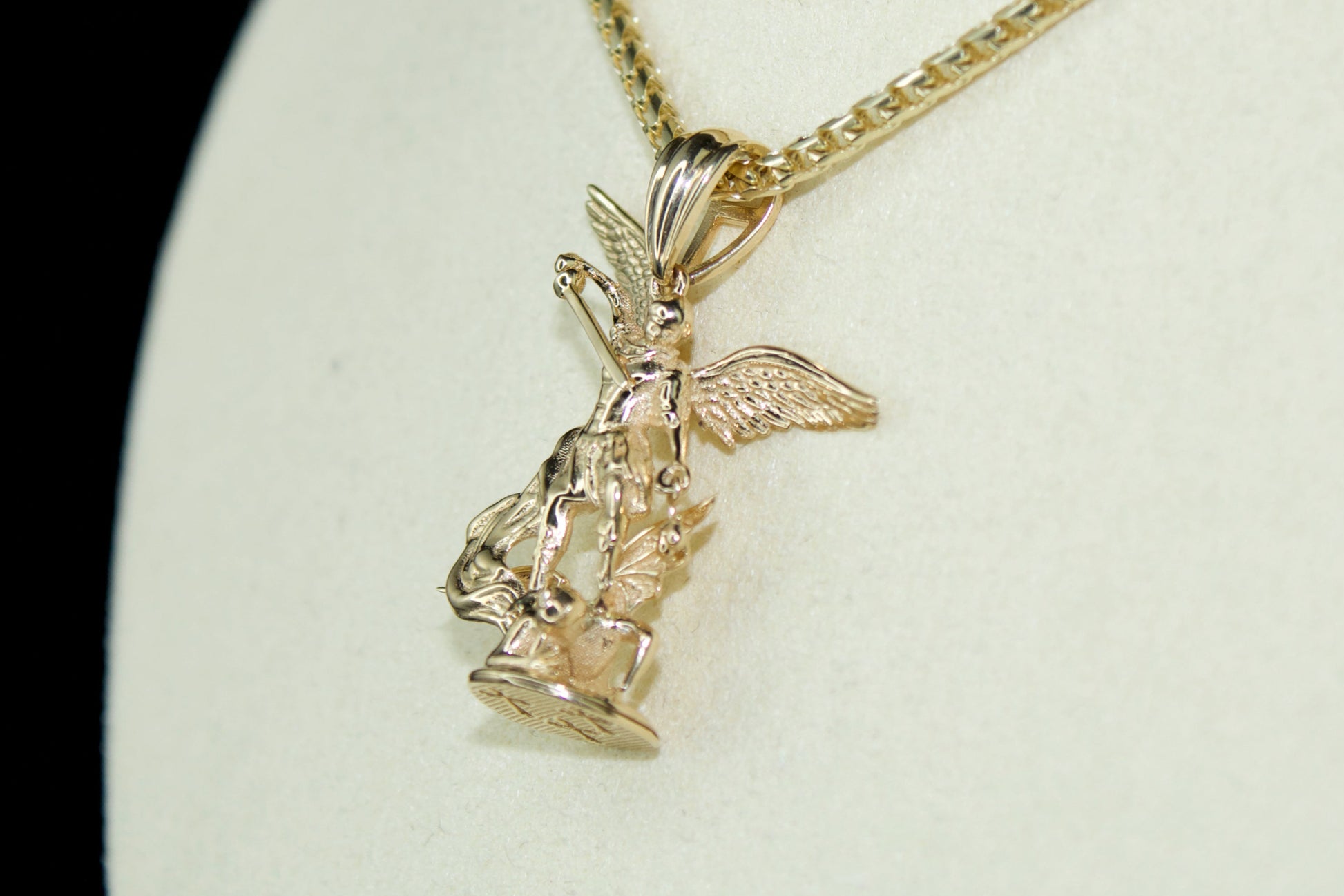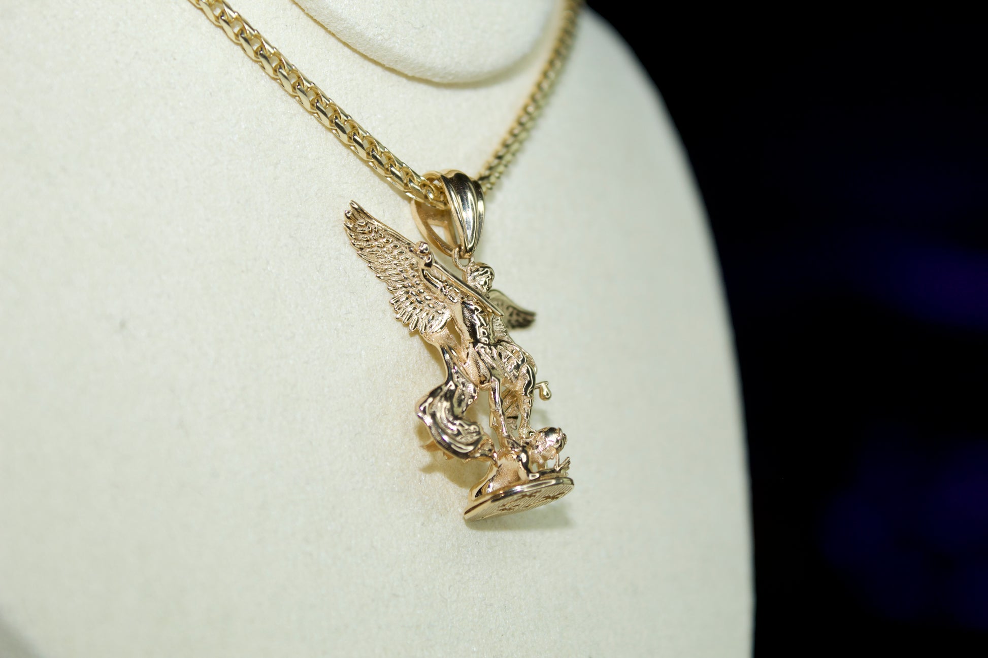 This fully 3D San Miguel Arcángel pendant is crafted in solid 14K gold and built with weight, depth, and detail. It captures the Archangel mid-battle, representing strength and protection in stunning high-relief. A heavy, standout piece that speaks for itself — perfect for collectors who want presence and purpose in their jewelry.