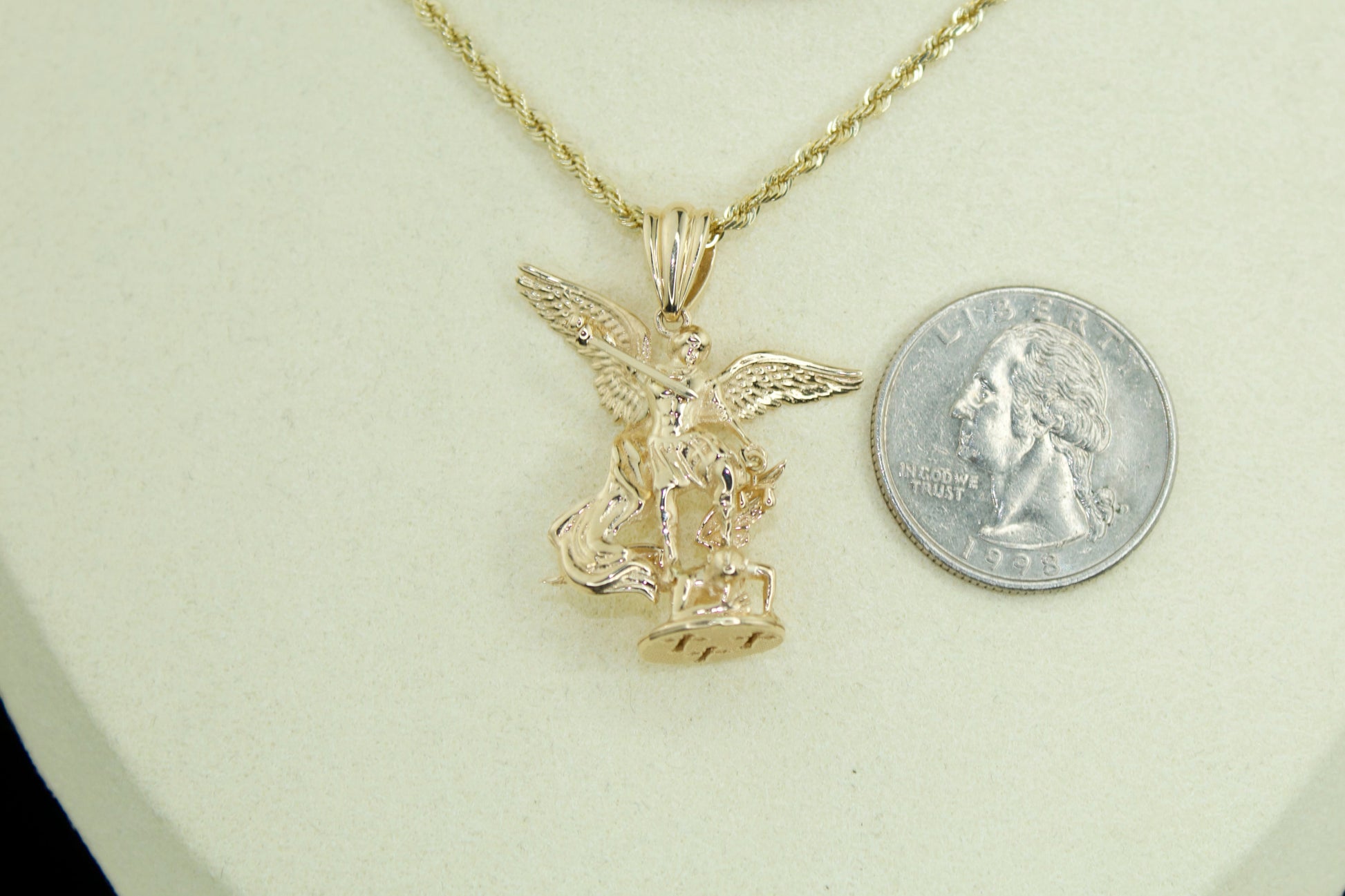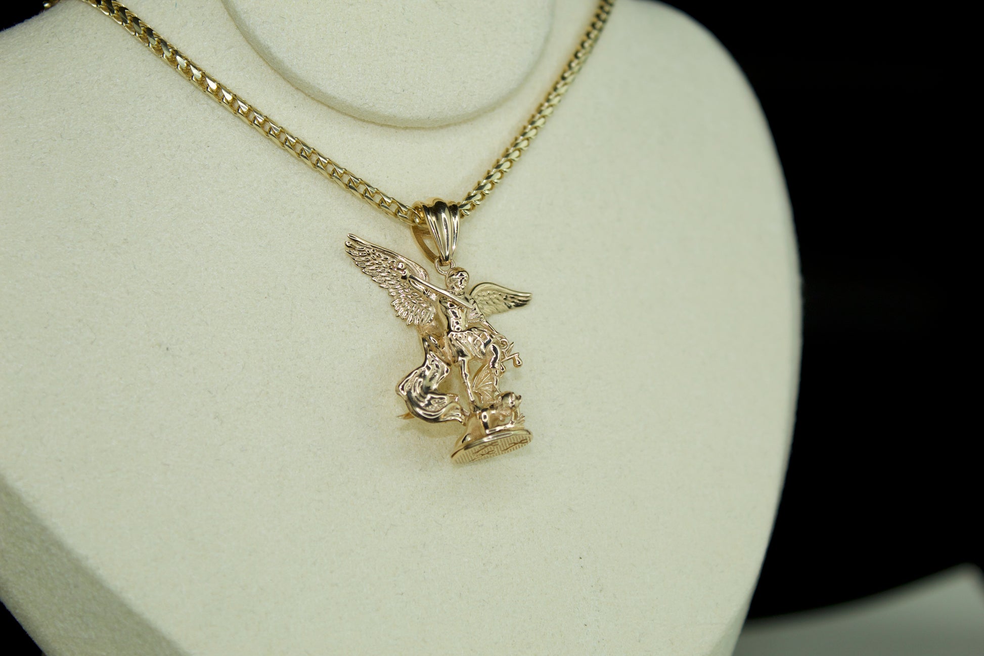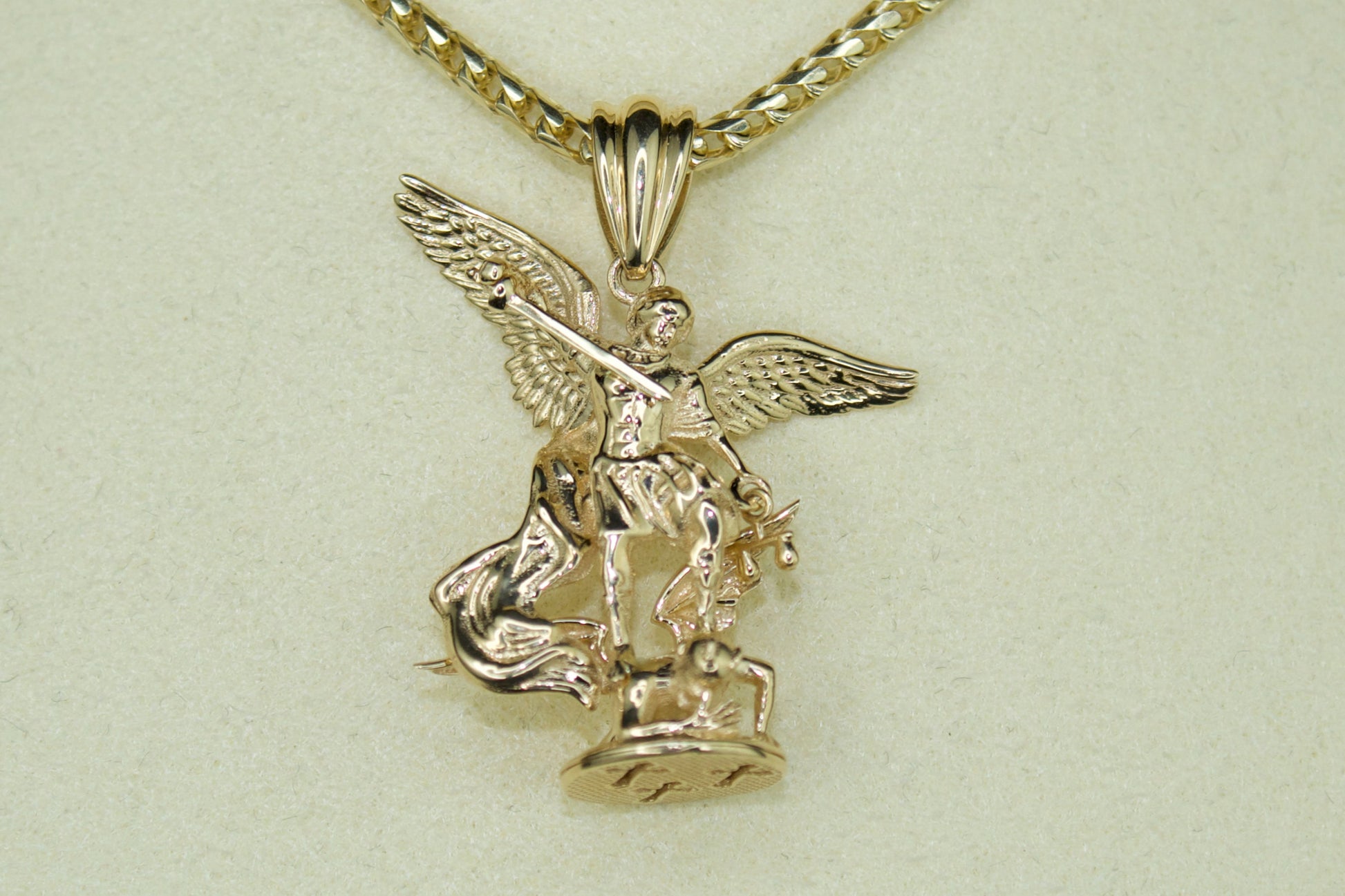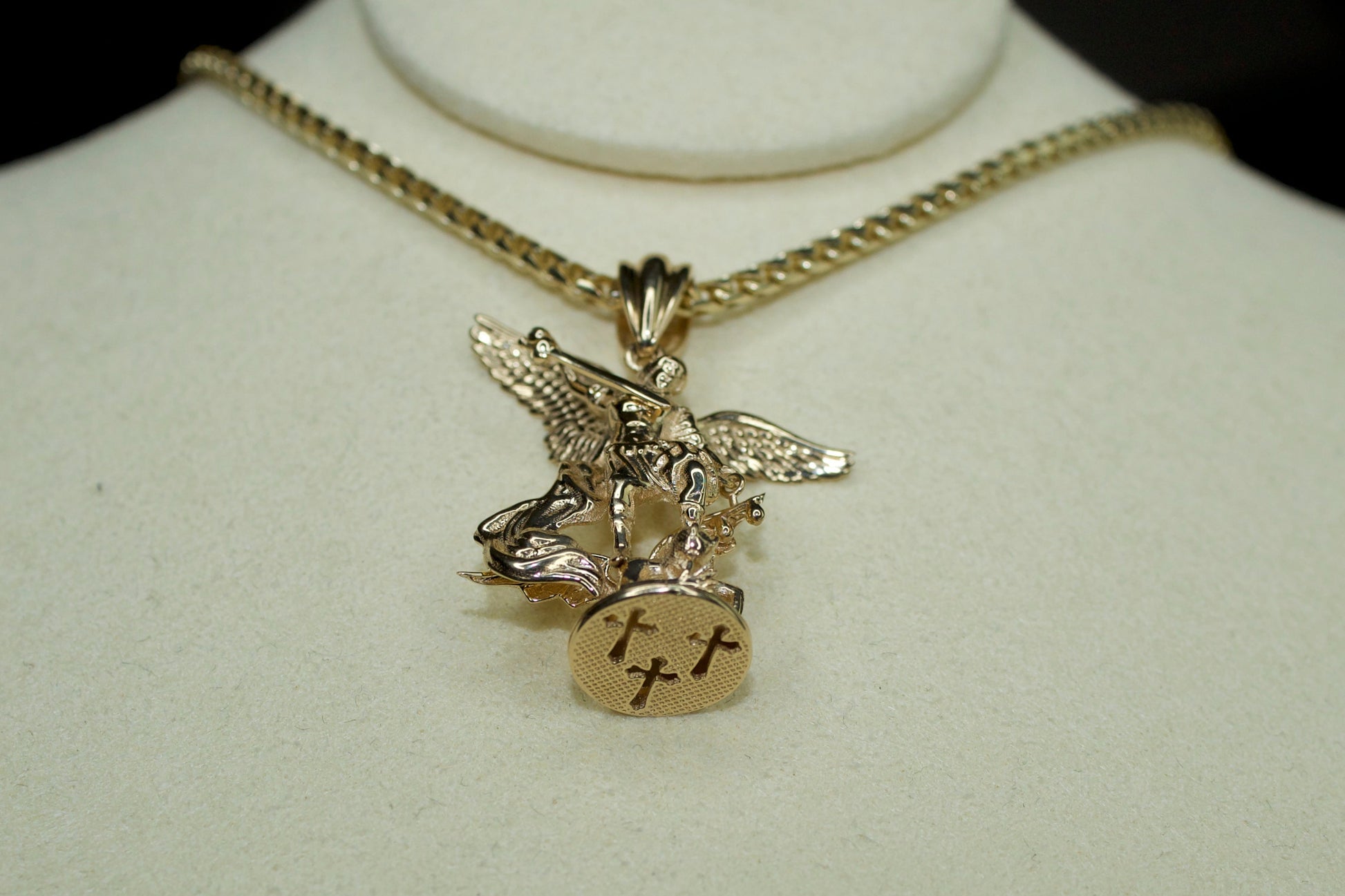 This fully 3D San Miguel Arcángel pendant is crafted in solid 14K gold and built with weight, depth, and detail. It captures the Archangel mid-battle, representing strength and protection in stunning high-relief. A heavy, standout piece that speaks for itself — perfect for collectors who want presence and purpose in their jewelry.