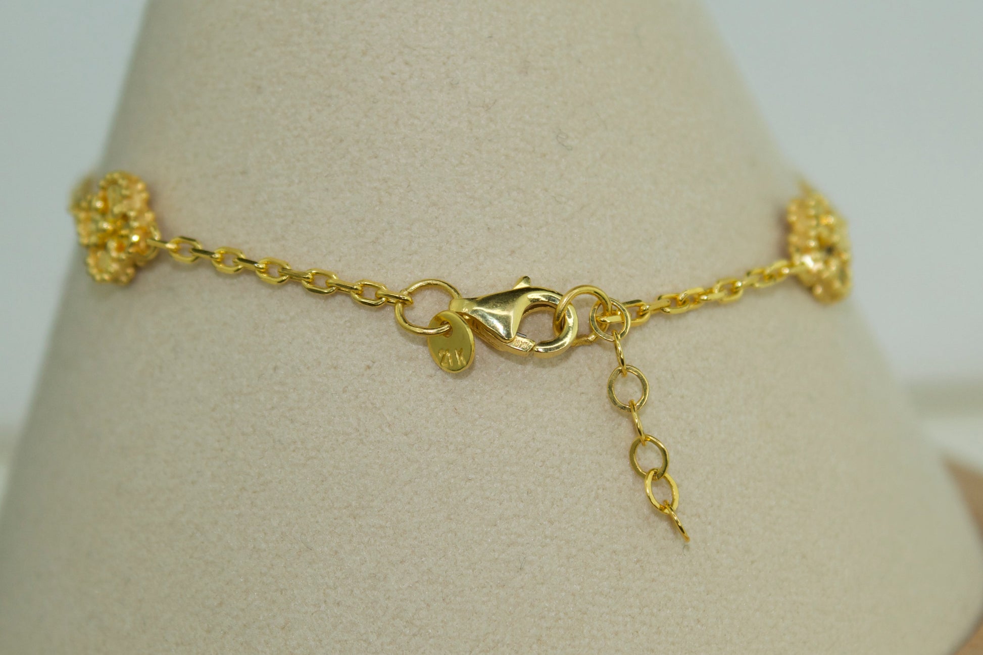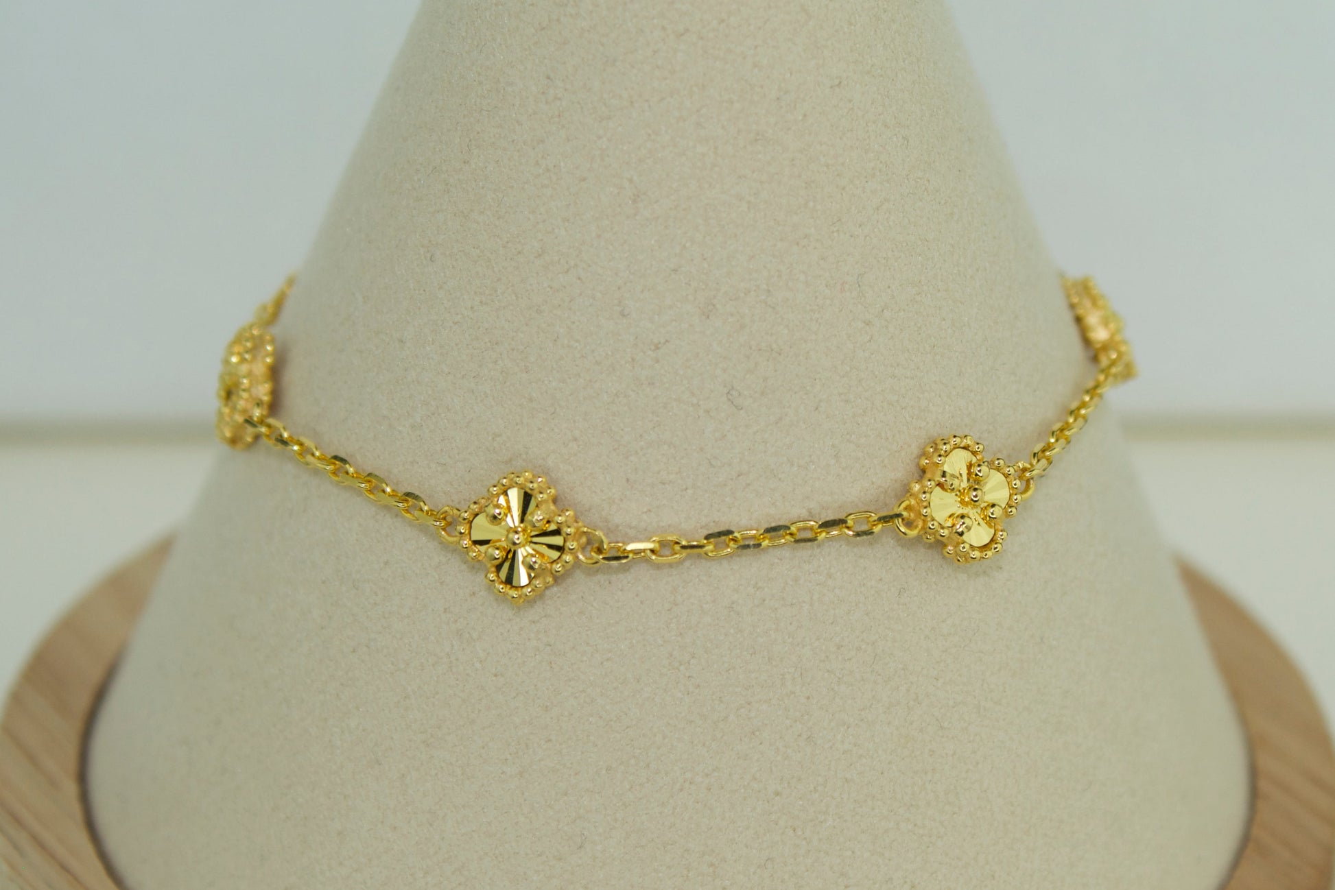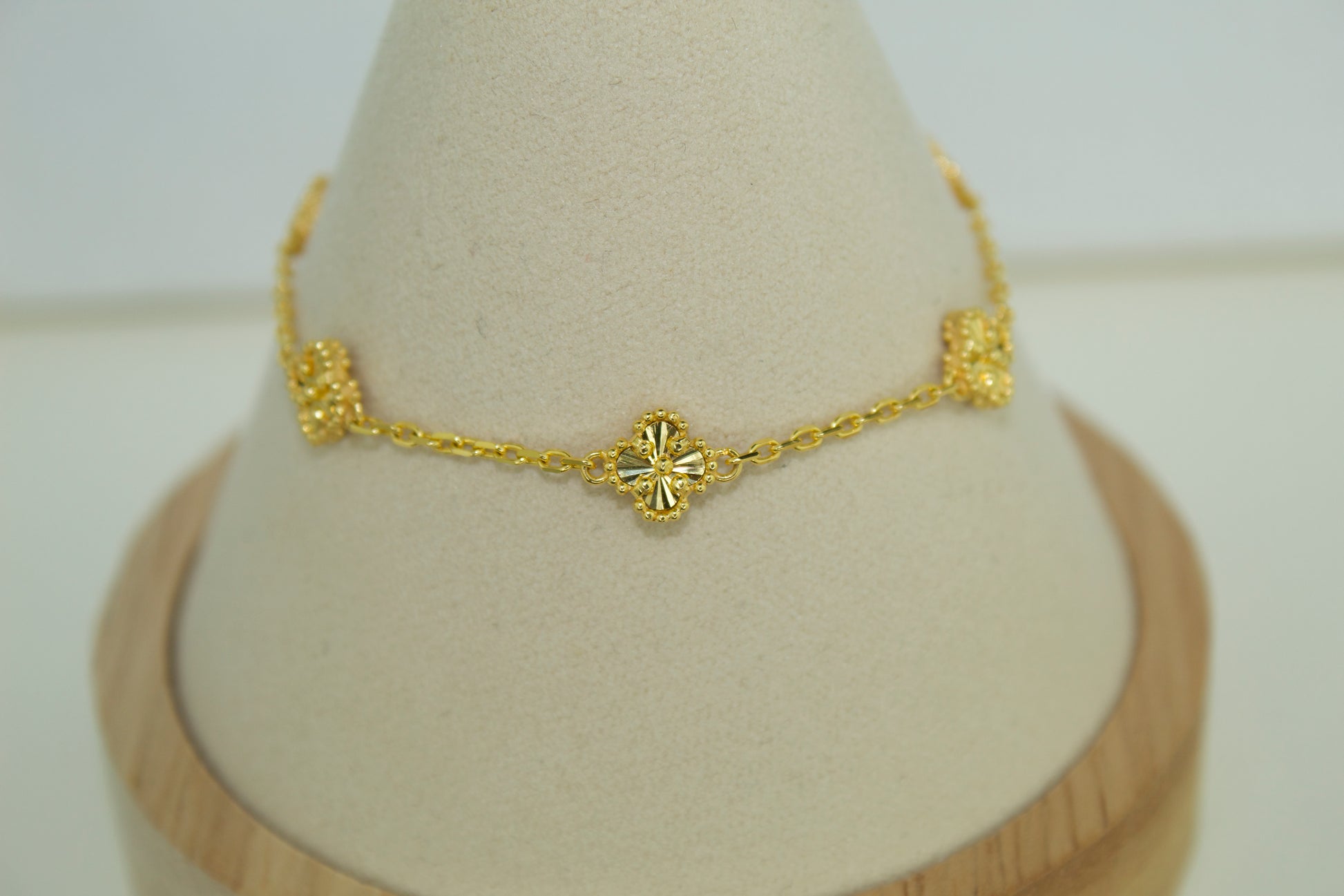 Part of our exclusive No. 21 Collection, this bracelet is crafted in solid 21K gold and imported directly from Dubai. Featuring a delicate lineup of diamond-cut clover motifs, it balances bold purity with refined elegance. Its deep yellow tone and hand-finished details make it a standout piece in any collection.