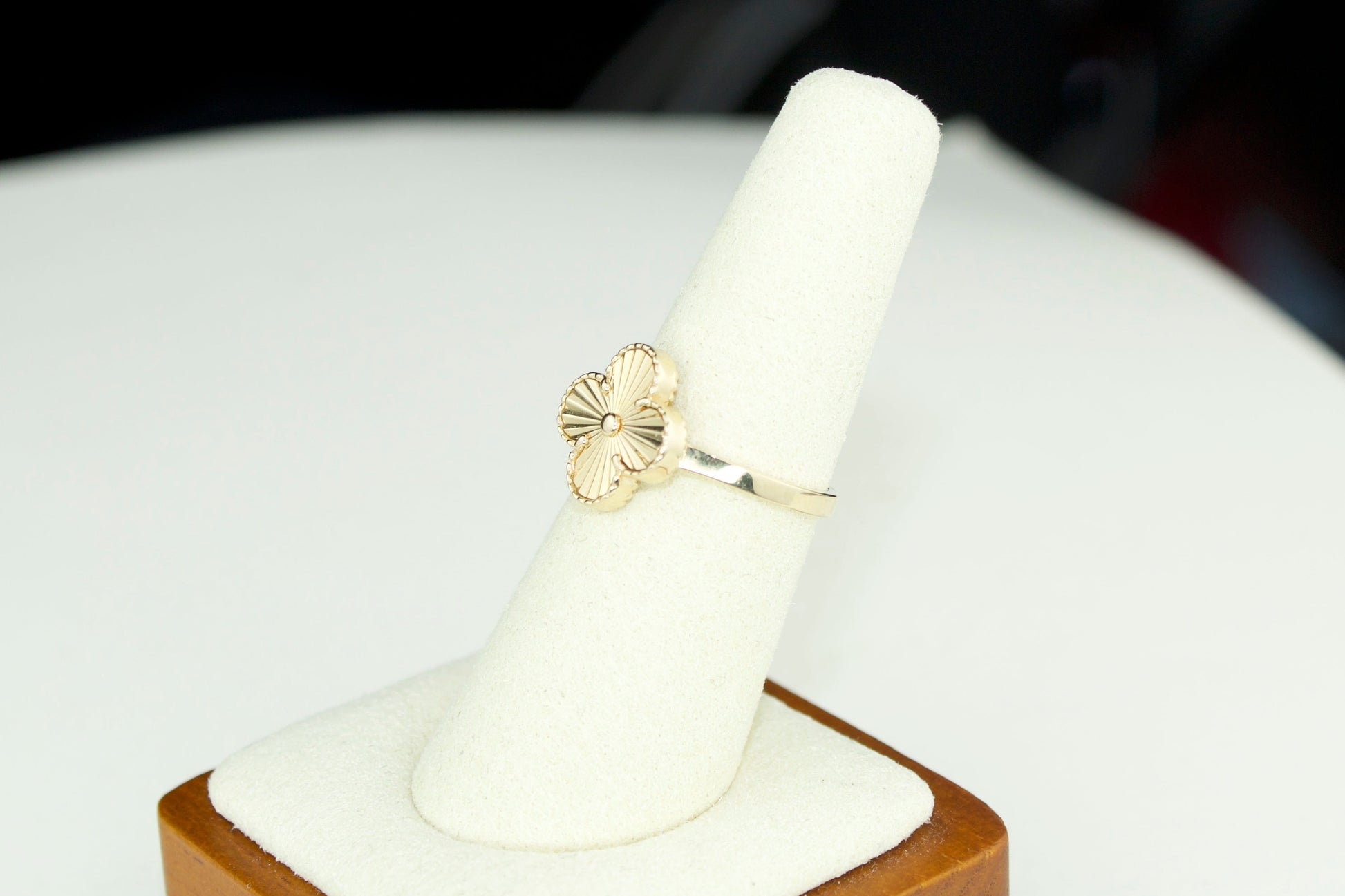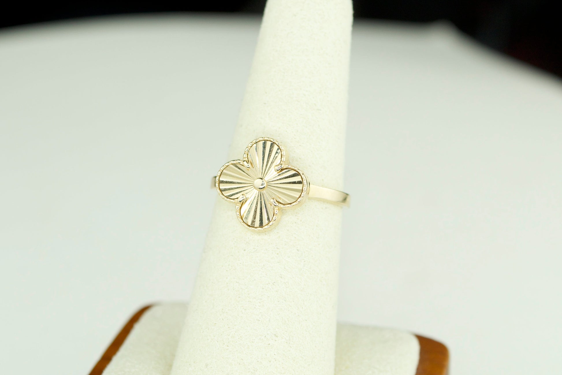 This solid 14K clover ring is a refined everyday piece designed with balance, detail, and lasting value in mind. Crafted entirely in solid 14K gold, the clover features diamond-cut starburst detailing that catches light beautifully while maintaining a clean, timeless look.