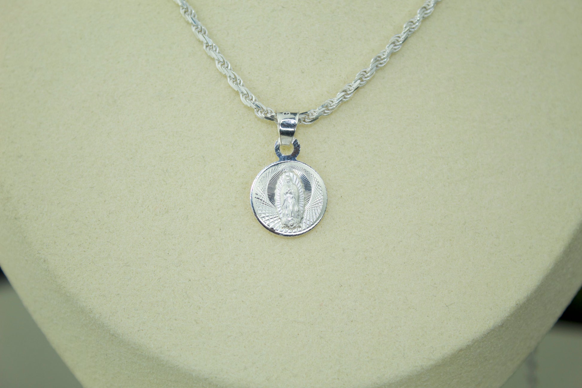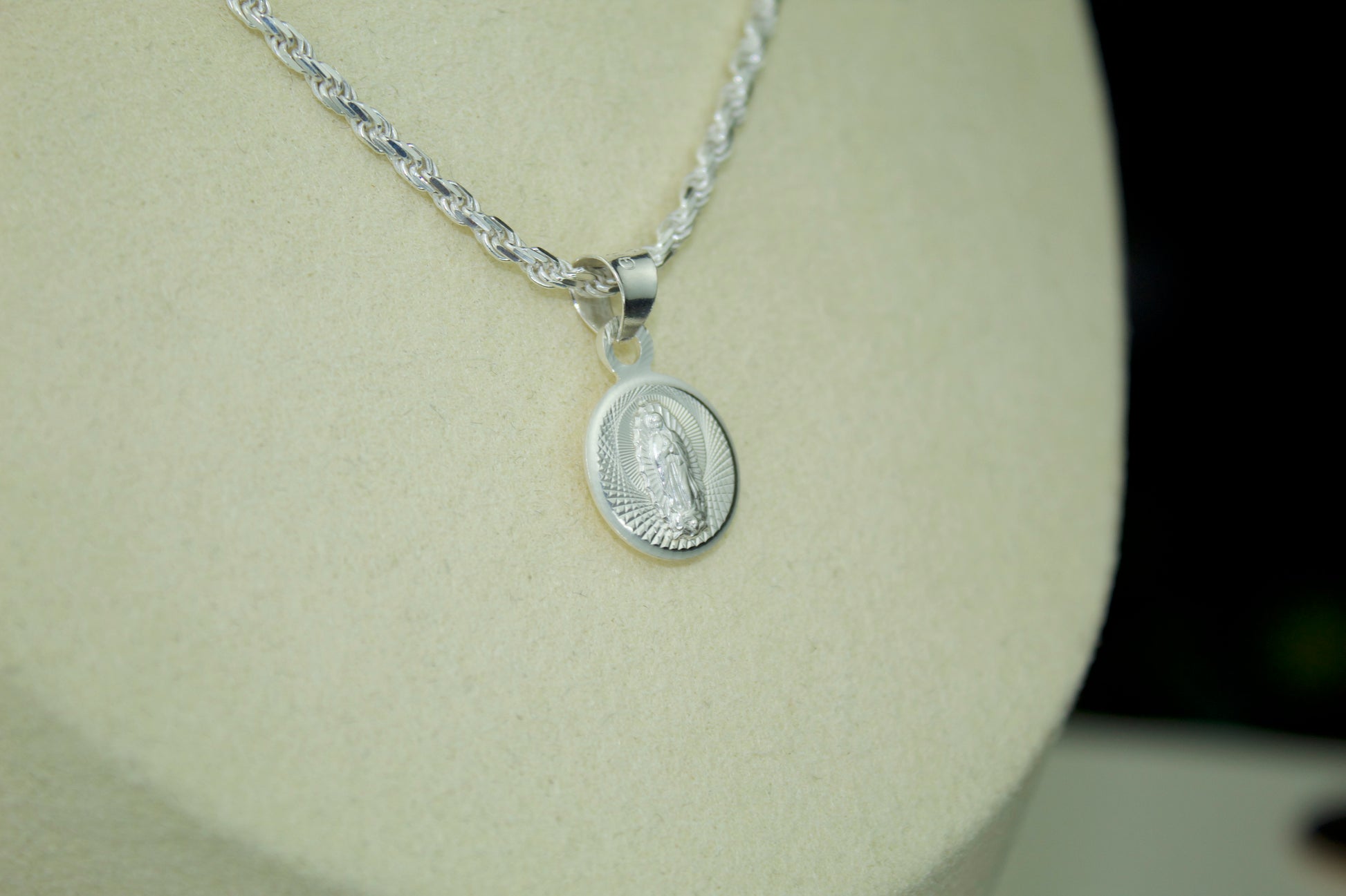 A timeless piece of faith and craftsmanship, this double-sided pendant features two sacred designs: the Sacred Heart of Jesus on one side and the Virgen de Guadalupe on the other. Crafted in genuine .925 sterling silver, it’s fully solid and finished with radiant diamond-cut details that catch light beautifully from every angle.