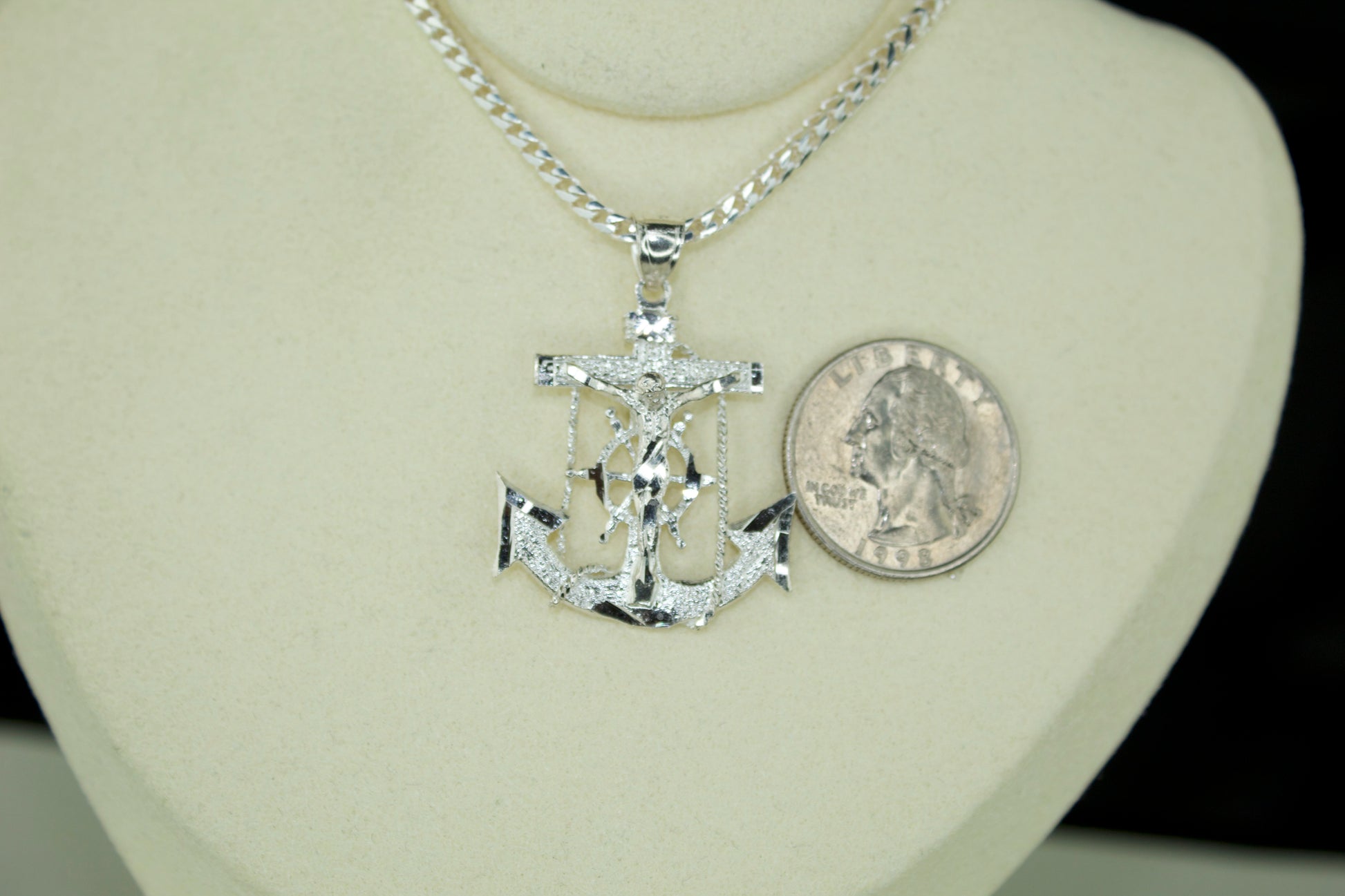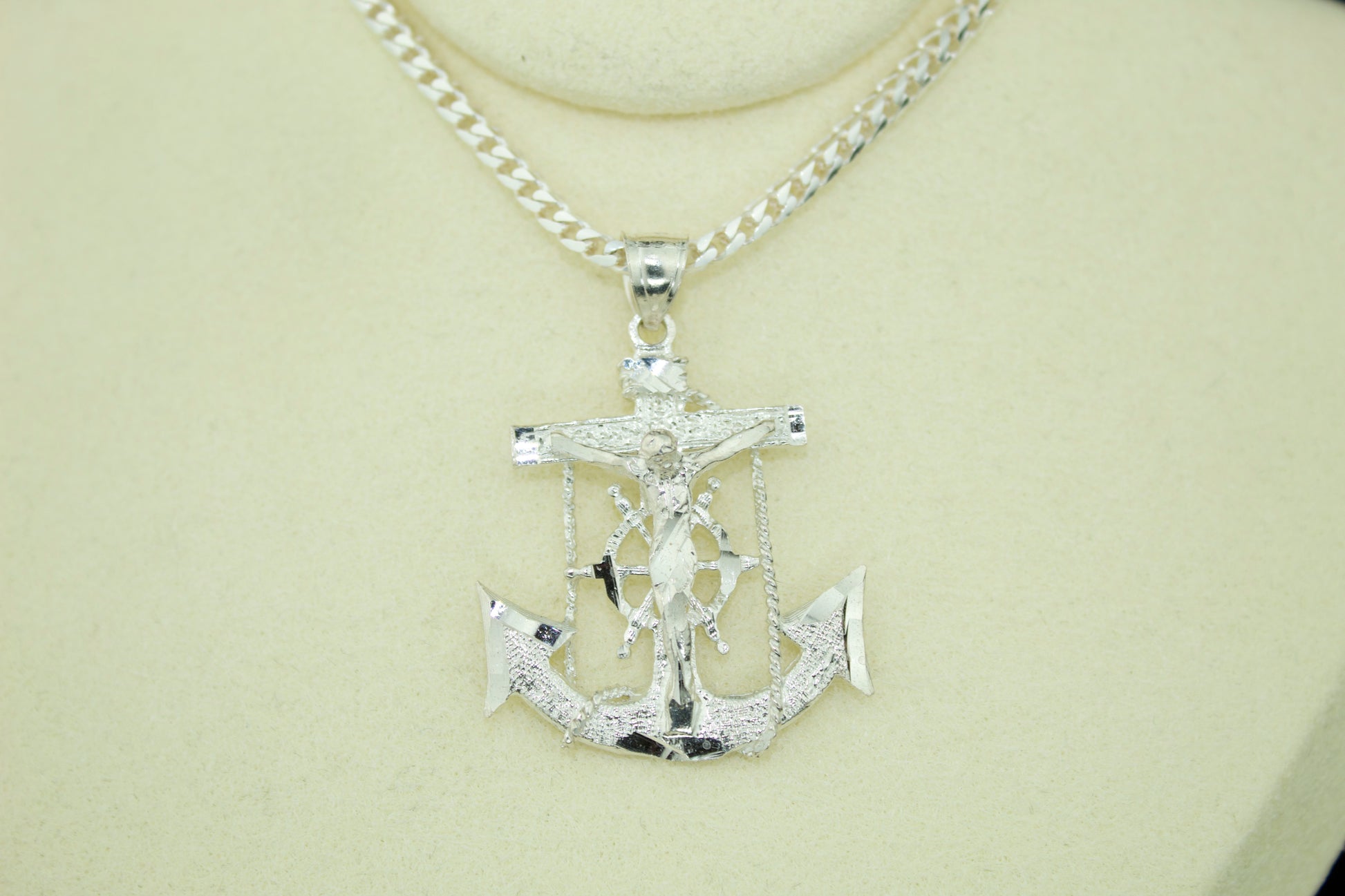 Crafted in genuine .925 sterling silver, this large Anchor Cross pendant captures both faith and strength in one bold design. The detailed crucifix and anchor represent hope, stability, and devotion — a meaningful piece handcrafted with intricate textures and a mirror finish that catches the light beautifully.