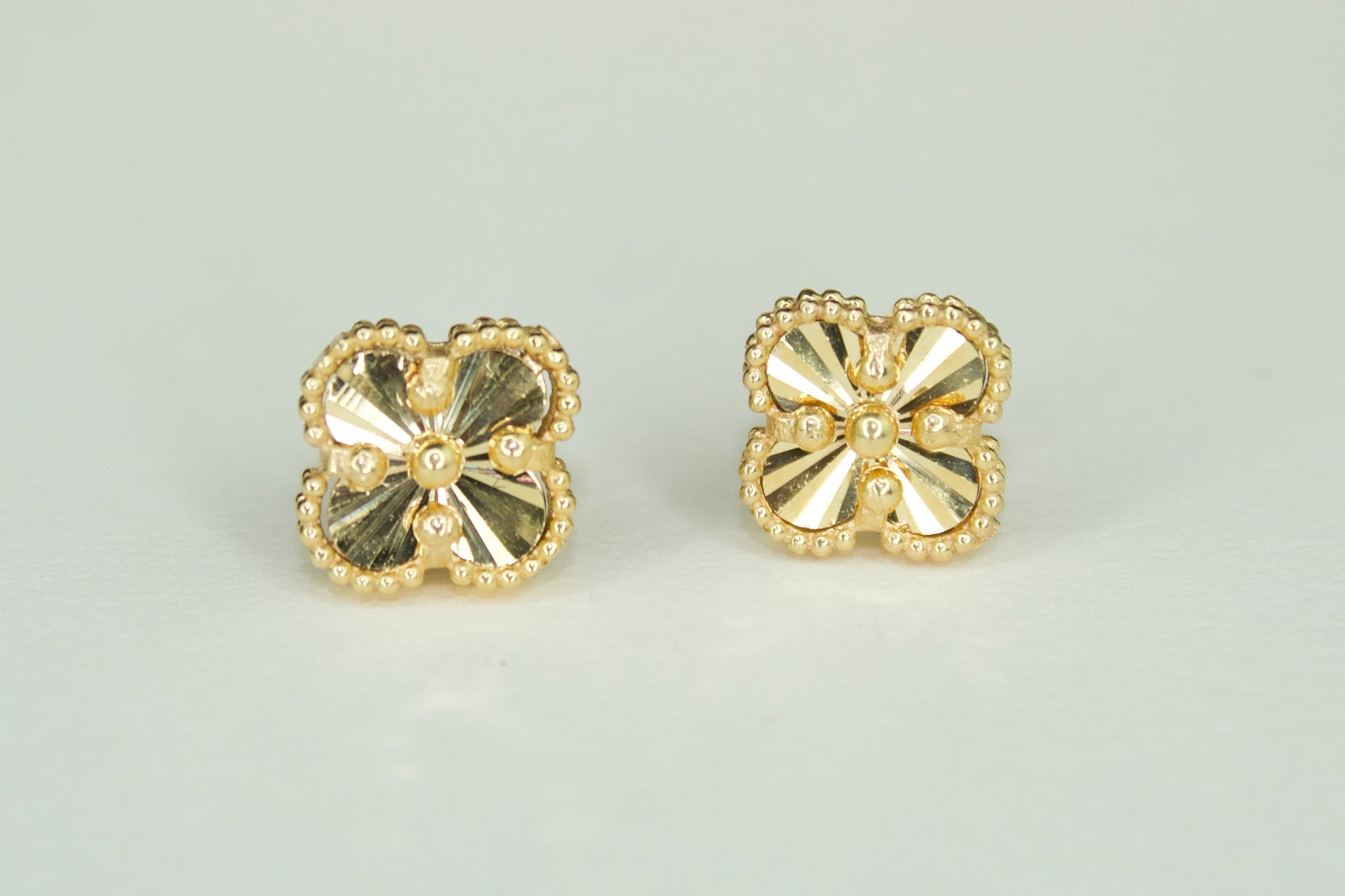 From our exclusive No.21 Collection, these clover studs are crafted in solid 21K gold and imported directly from Dubai. Featuring a radiant diamond-cut starburst pattern framed with bead-edge detailing, they shine with both elegance and craftsmanship.