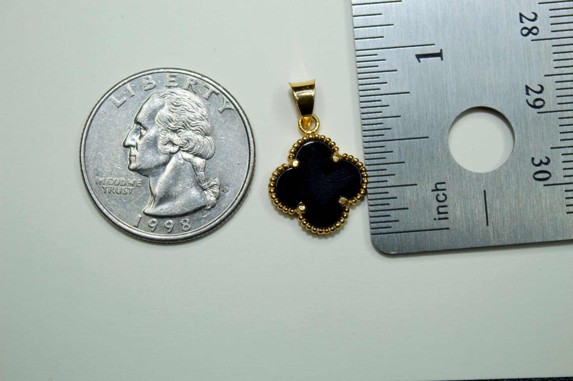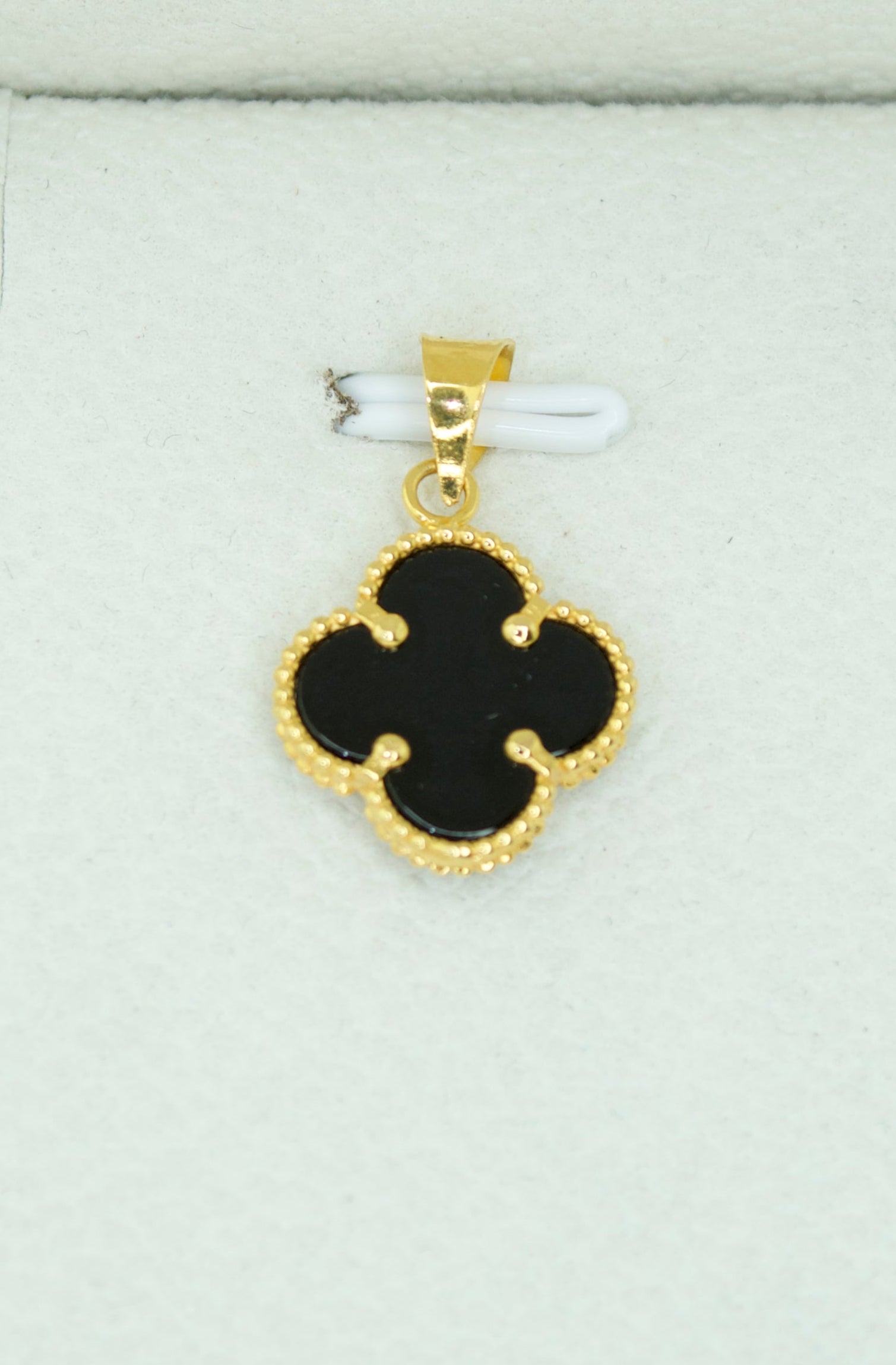 This solid 21 karat clover pendant is a refined statement piece crafted for those who appreciate high karat gold, bold contrast, and real substance. The pendant is made entirely in solid 21K and features a genuine onyx inlay, framed by a polished bead edge design that highlights the richness of high karat gold while maintaining a timeless, elegant presence.