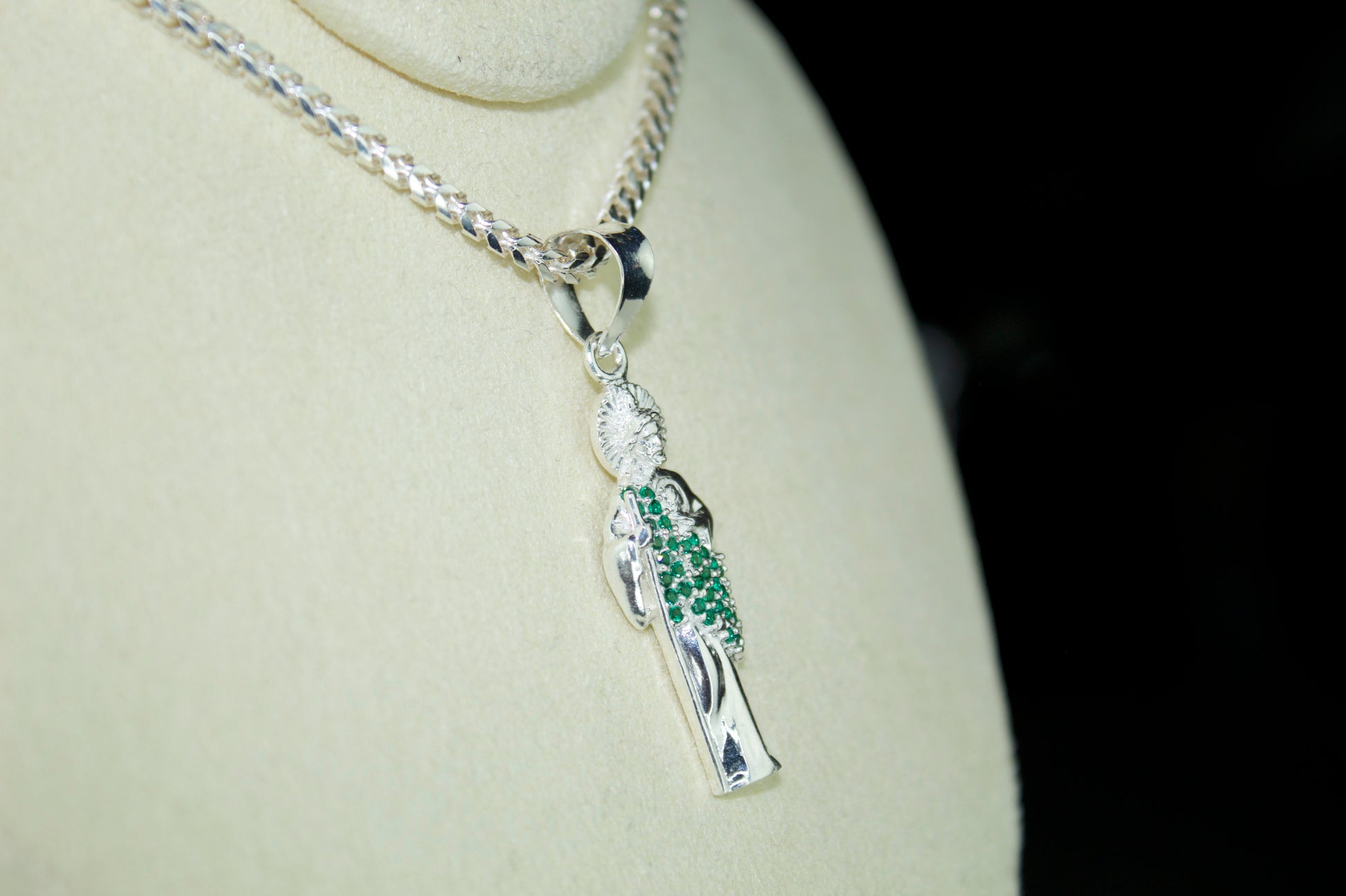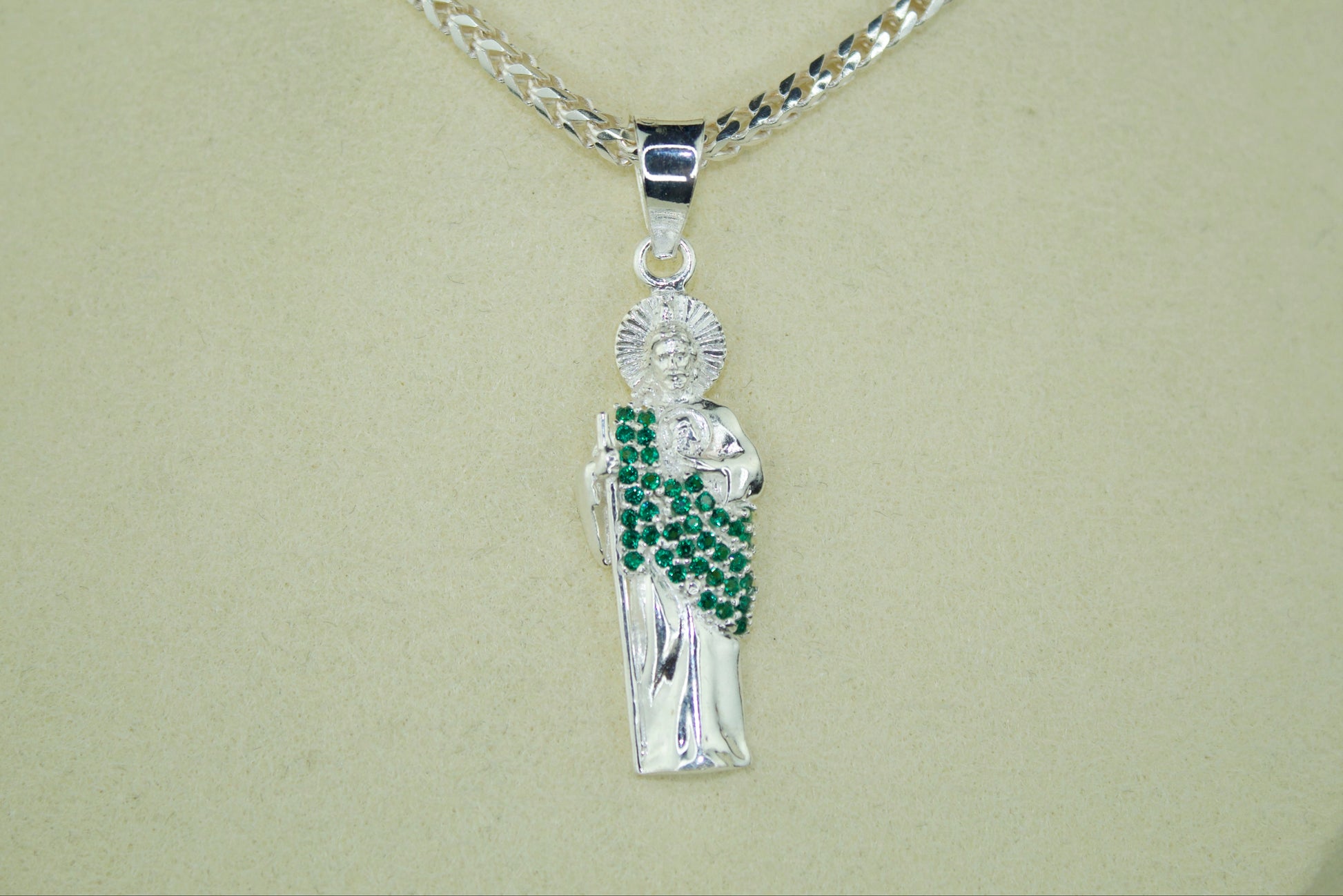 Crafted in genuine .925 sterling silver, this San Judas pendant carries a message of faith and devotion. Its detailed design is accented with rich green stones that highlight the traditional robe of Saint Jude, bringing a meaningful touch of color and craftsmanship.
