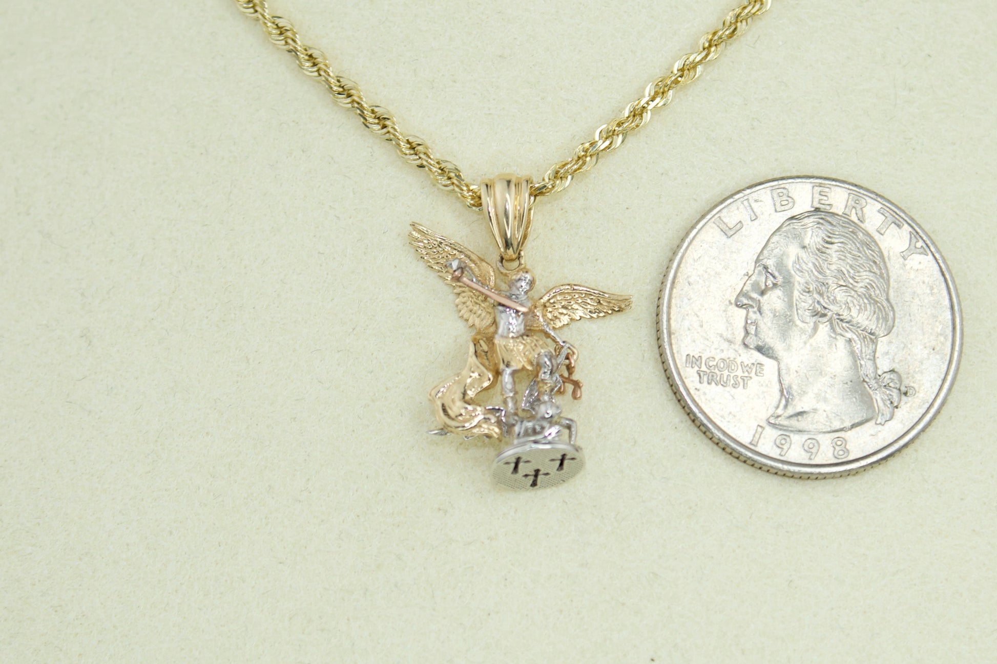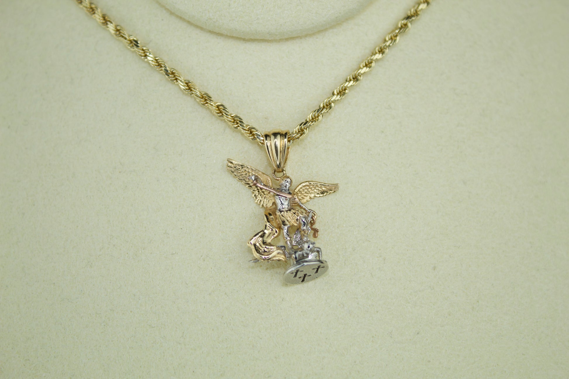 This detailed 3D handmade pendant of San Miguel Arcángel captures the powerful moment of victory over evil. With tri-color gold accents and fine craftsmanship, this piece was created exclusively for Oro Arcia in very limited quantities. Each detail—his wings, sword, and the fallen figure beneath—was hand-carved and carefully polished to honor the meaning behind the design. Perfect for those who carry strength and faith close to their heart.