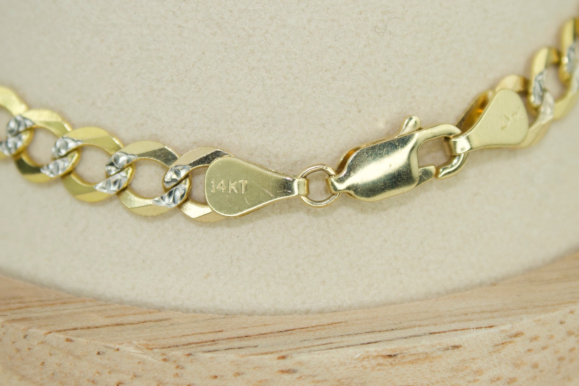 This bold and elegant Cuban link bracelet is crafted from solid 14K gold with a striking two-tone finish. The diamond-cut center adds light-catching brilliance, while the classic yellow gold frame keeps it timeless. A sleek everyday piece or standout layering bracelet — made for those who like their gold real and their look refined.