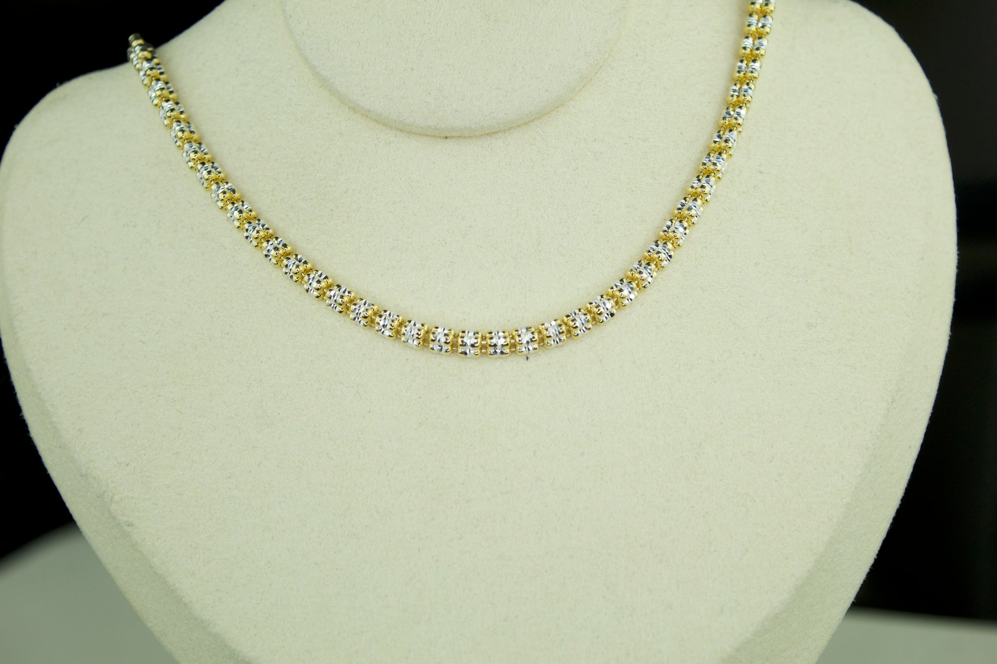 This handmade Ice Necklace .925 Silver Version is crafted in solid .925 silver and finished with 14K gold plating and rhodium plating for enhanced shine and durability. Precision ice cut links are designed to reflect light intensely, creating a high brilliance sparkle that delivers the iced look without the use of diamonds or stones. The polished finish and detailed cuts give this piece depth, clarity, and a refined presence.