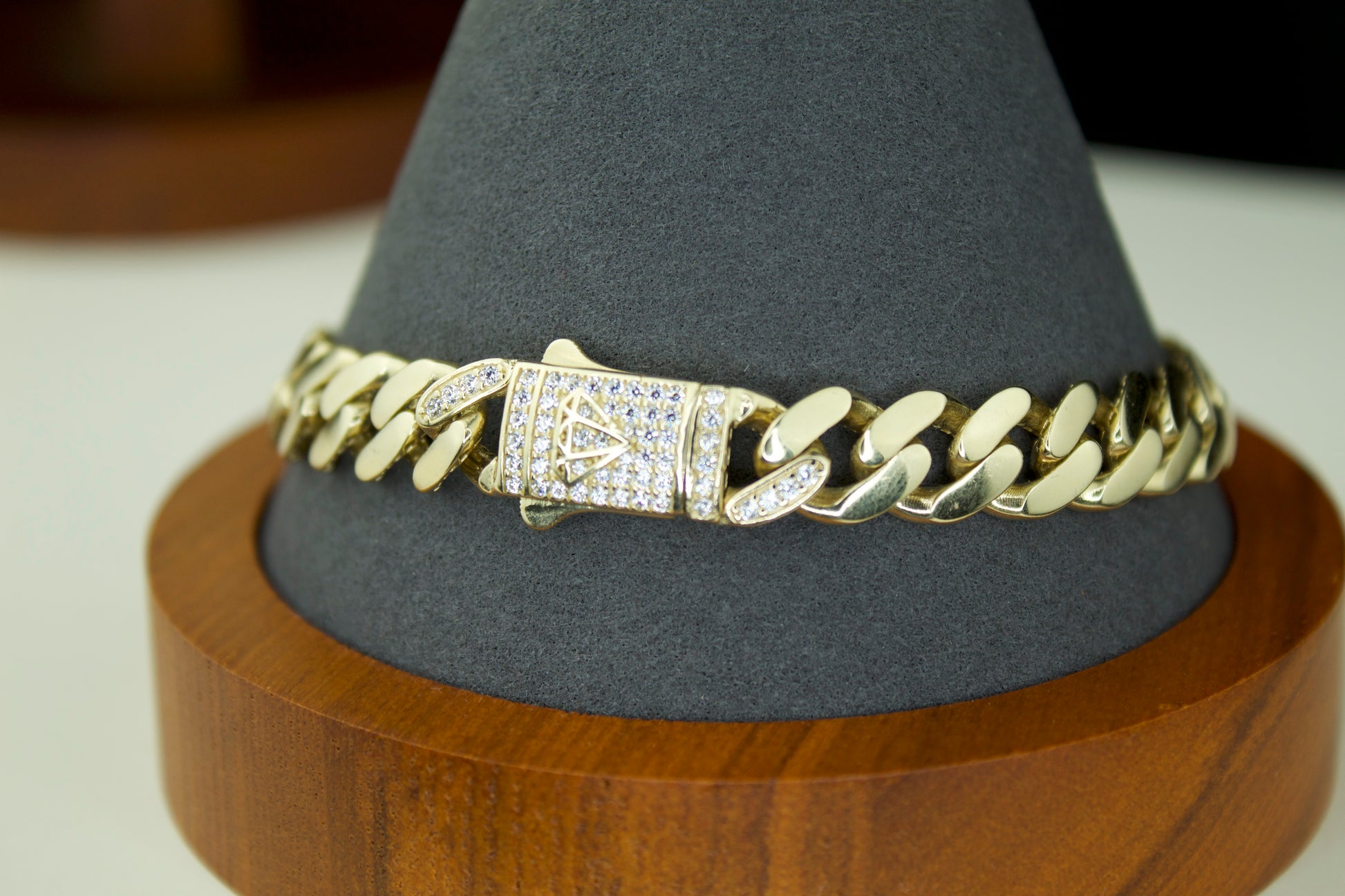 Finished with a high-polish surface, the Miami Cuban links flow seamlessly into a custom clasp accented with CZ stones, adding brilliance and detail without the use of diamonds. The balance between weight, width, and craftsmanship makes this bracelet feel elevated, solid, and intentional.