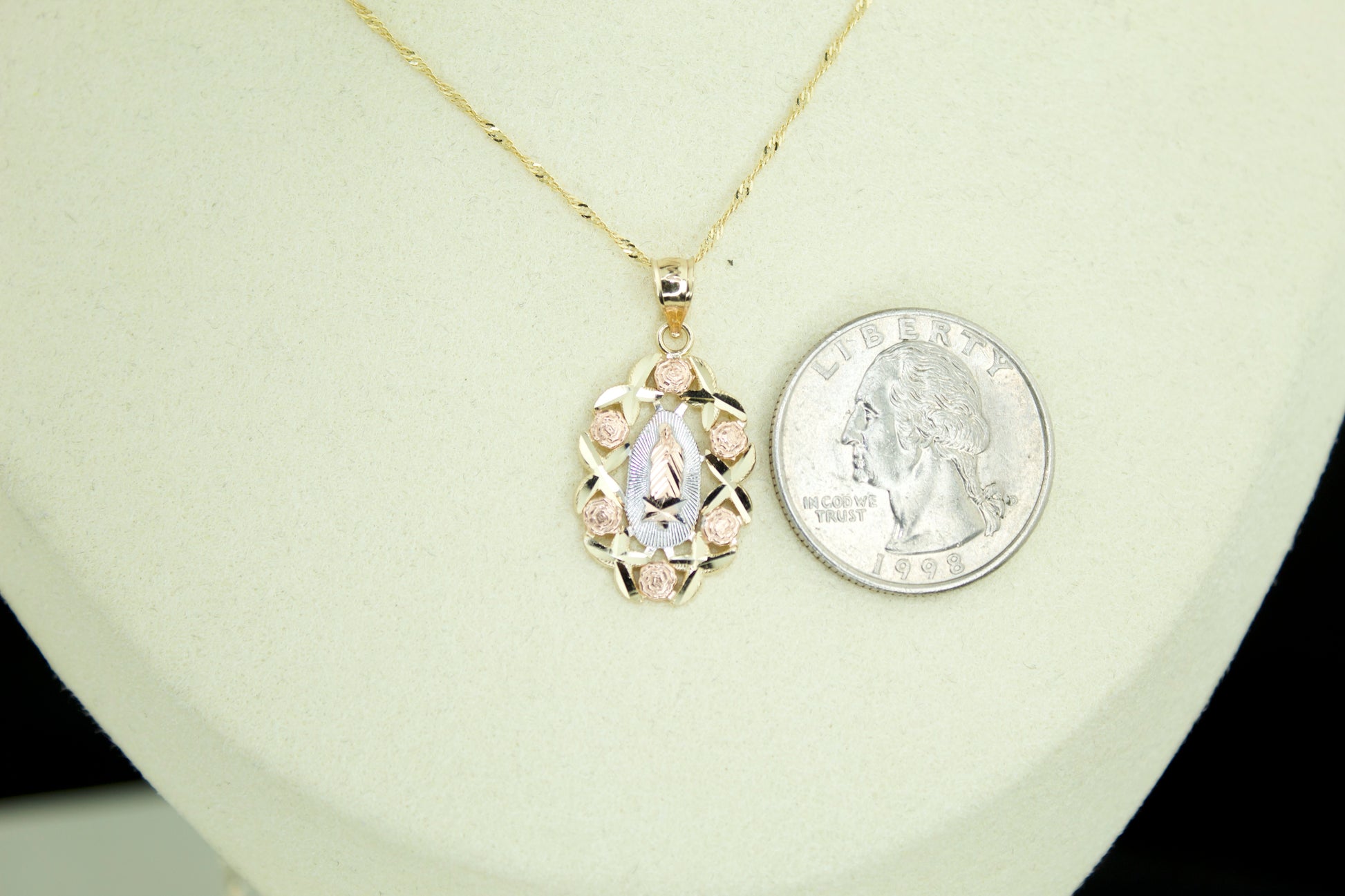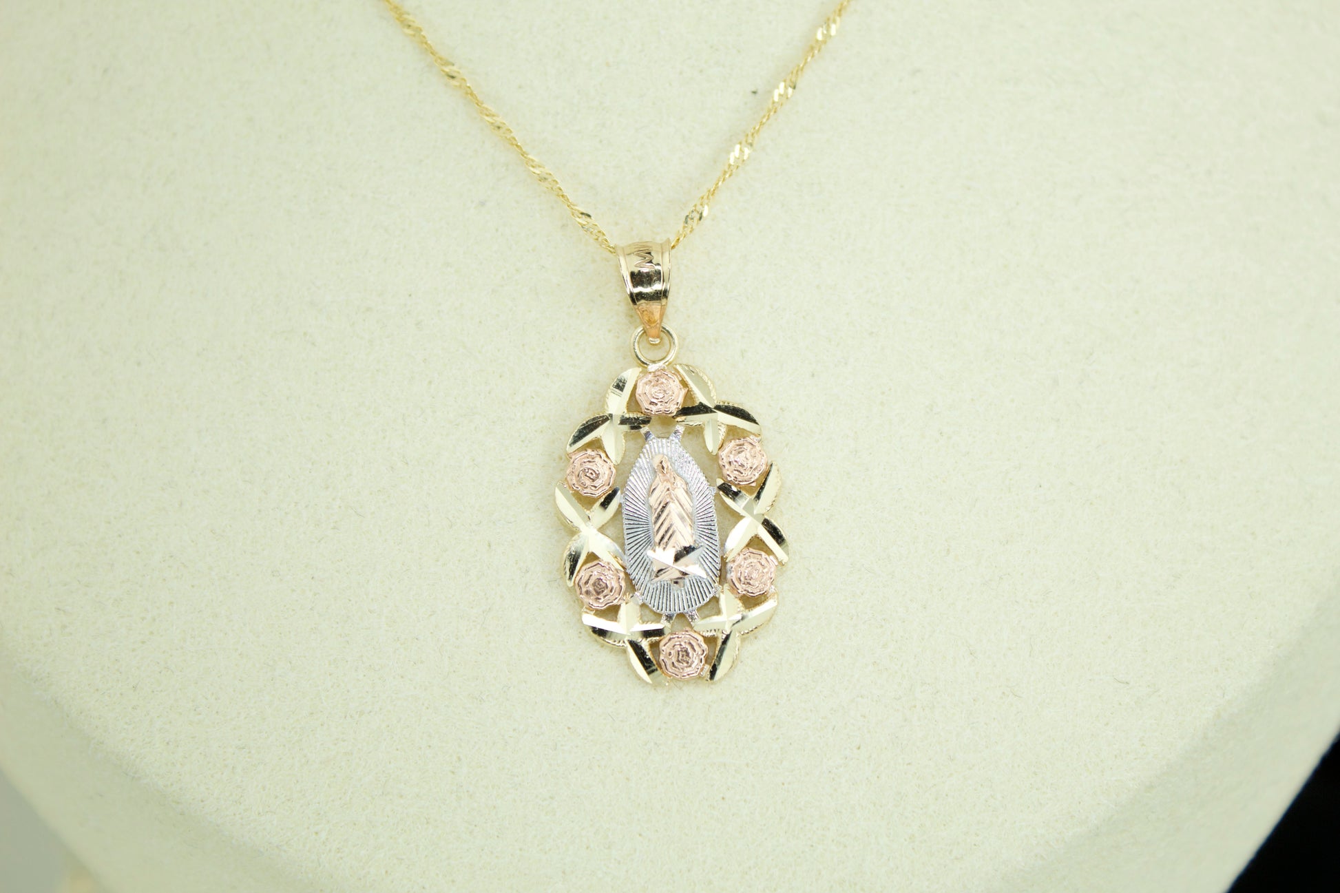 This handmade solid 14K gold Virgencita pendant set is crafted in an elegant 3 tone finish of yellow, white, and rose gold. The center features a detailed depiction of the Virgencita, framed by intricate diamond cut detailing that enhances brilliance without the use of stones. The layered tones and polished finish give this piece depth, balance, and timeless character.
